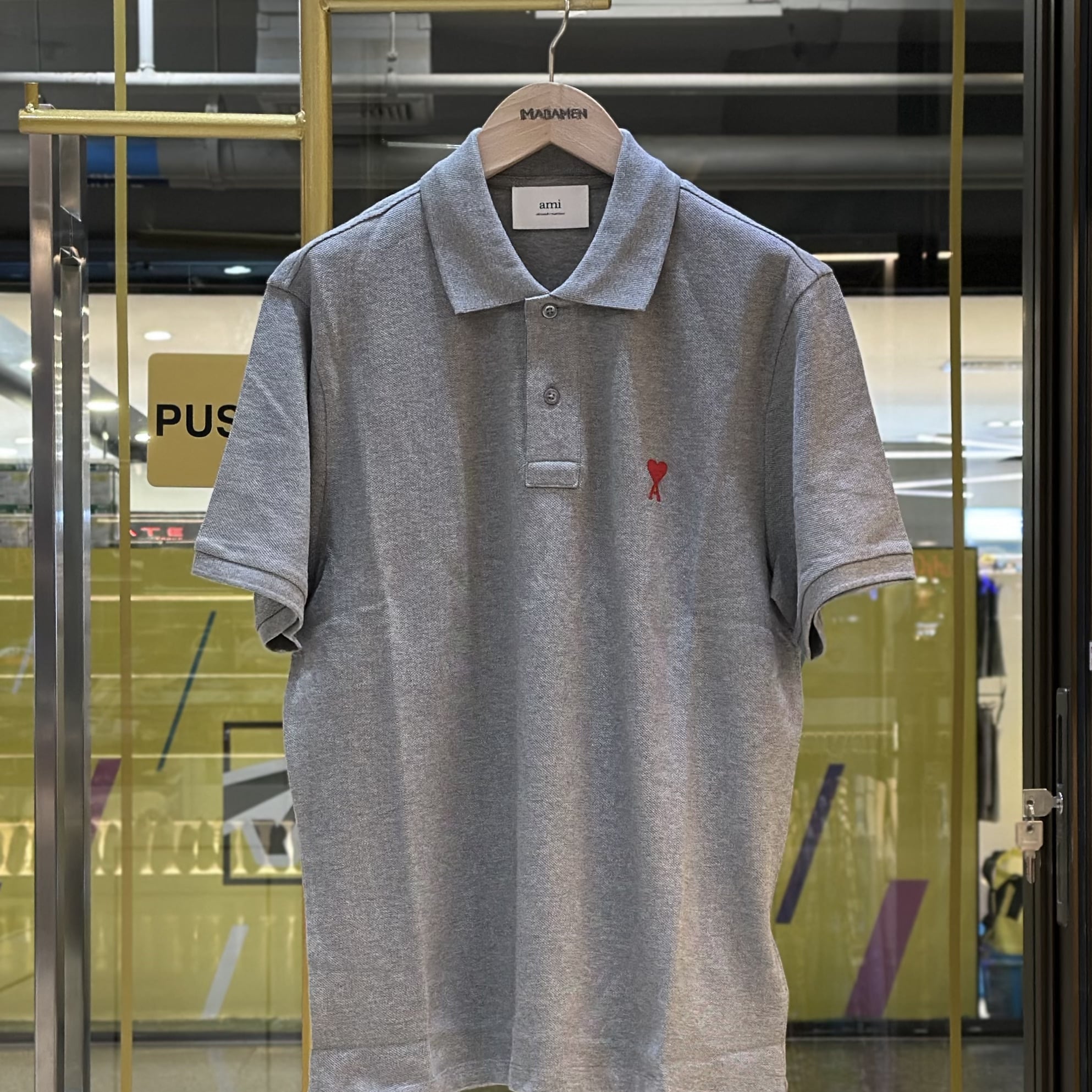 เสื้อยืดคอปกโปโล จากแบรนด์ Ami ปักลายโลโก้หัวใจสีแดงอันเป็นเอกลักษณ์ของแบรนด์ ด้านหลังคอเสื้อปักชื่อแบรนด์ตัวนูน