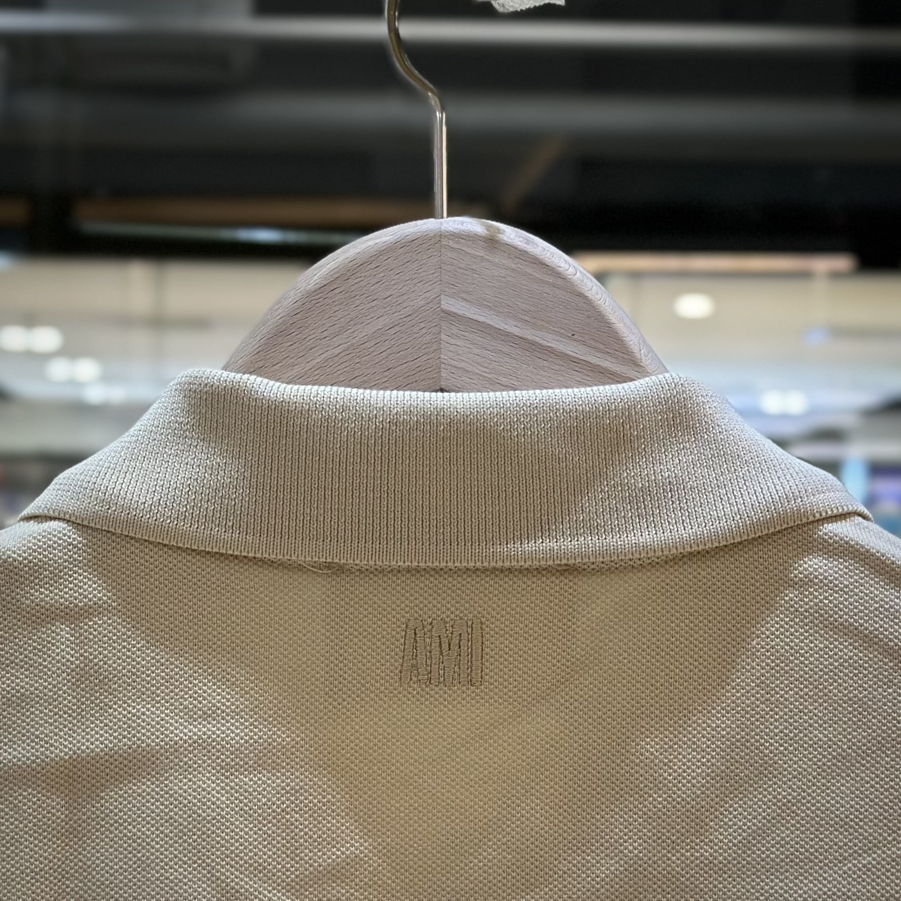 เสื้อยืดคอปกโปโล จากแบรนด์ Ami ปักลายโลโก้หัวใจสีแดงอันเป็นเอกลักษณ์ของแบรนด์ ด้านหลังคอเสื้อปักชื่อแบรนด์ตัวนูน