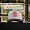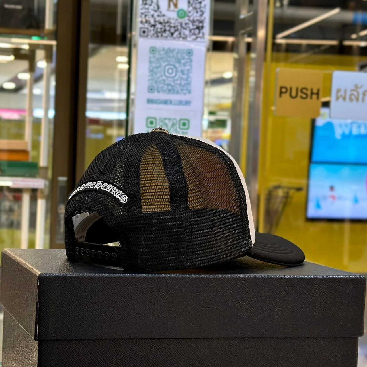 หมวกแก๊ป จากแบรนด์ Chrome Hearts พิมพ์ลายคำว่า Chrome Hearts Made in Hollywood California Fuck You ด้วยฟอนท์แบบโกธิคขนาดเล็ก และจัดเรียงเป็นรูปทรงสี่เหลี่ยมอย่างมีระเบียบ คล้ายกับแผ่นที่ใช้วัดสายตา