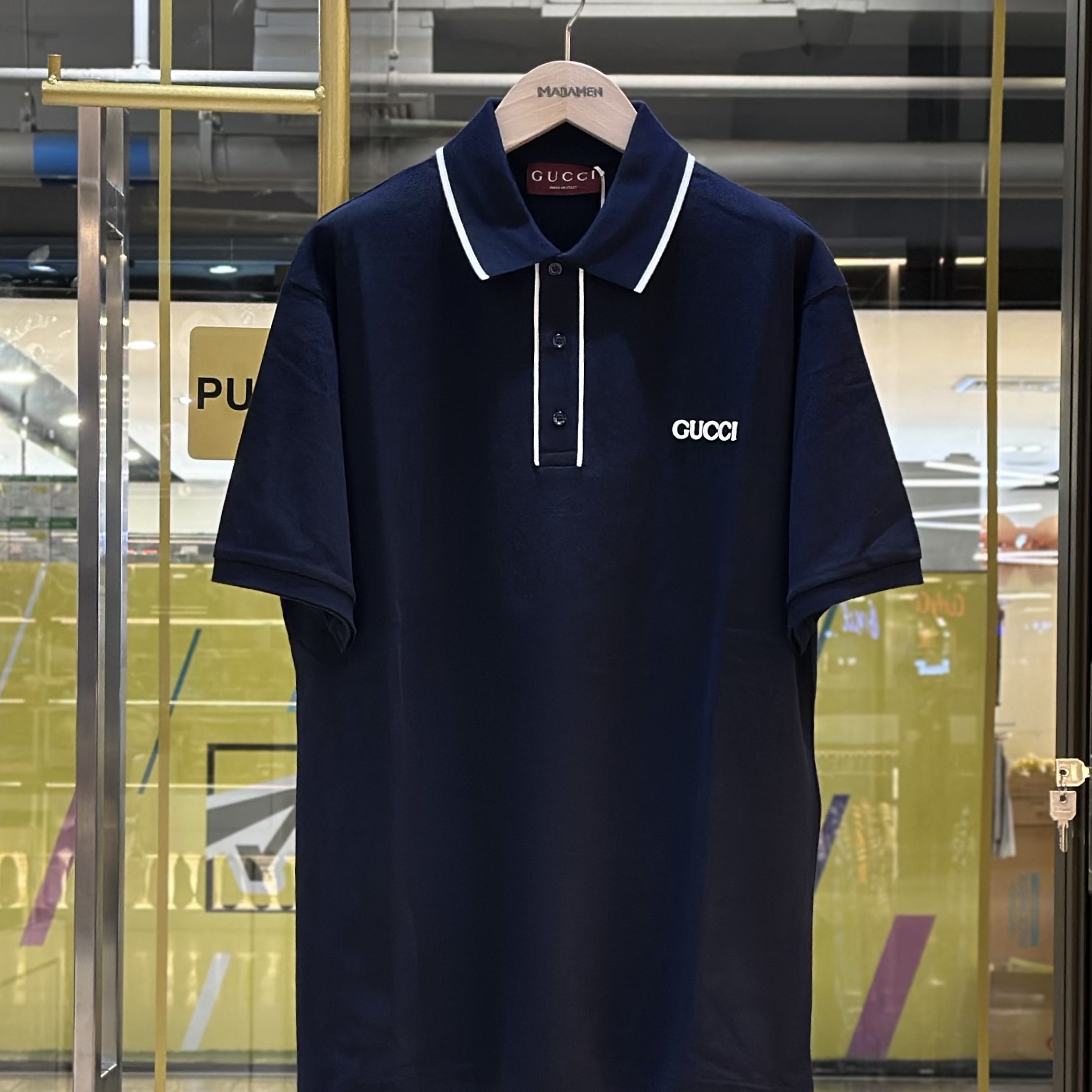 เสื้อยืดคอปกโปโล สำหรับผู้ชาย จากแบรนด์ Gucci ตกแต่งตัดขอบสีขาว ปักโลโก้ของแบรนด์ที่อกเสื้อ