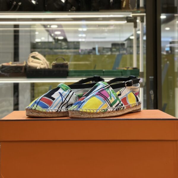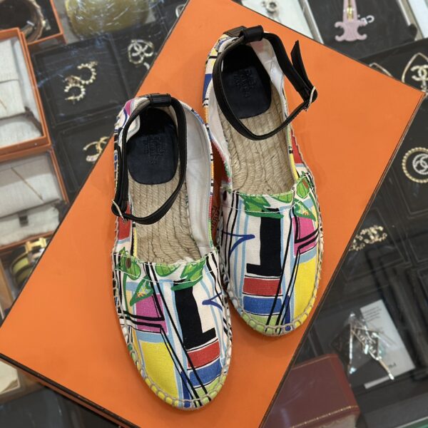 รองเท้าเอสพาดริลล์แบบมีสายรัด สำหรับผู้หญิง จากแบรนด์ Hermes พิมพ์ลวดลายสีสัน เหมาะสำหรับใส่ท่องเที่ยว