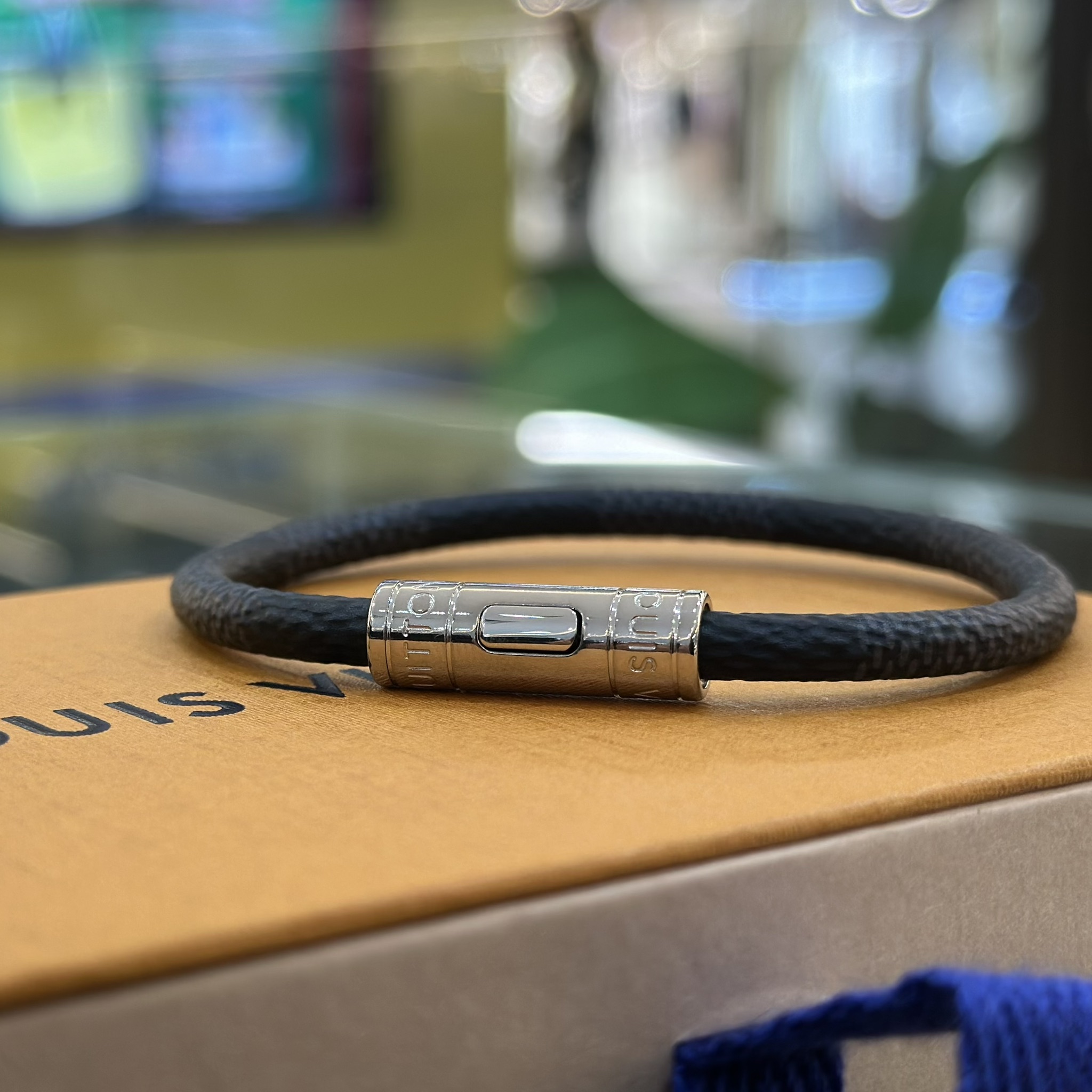 กำไลข้อมือ สำหรับผู้ชาย จากแบรนด์ Louis Vuitton ตัวล็อคสีเงินติดสัญลักษณ์ของแบรนด์ เปิด-ปิดได้สะดวก ดีไซน์เรียบ ๆ ทำให้ใช้งานได้ในทุกโอกาส