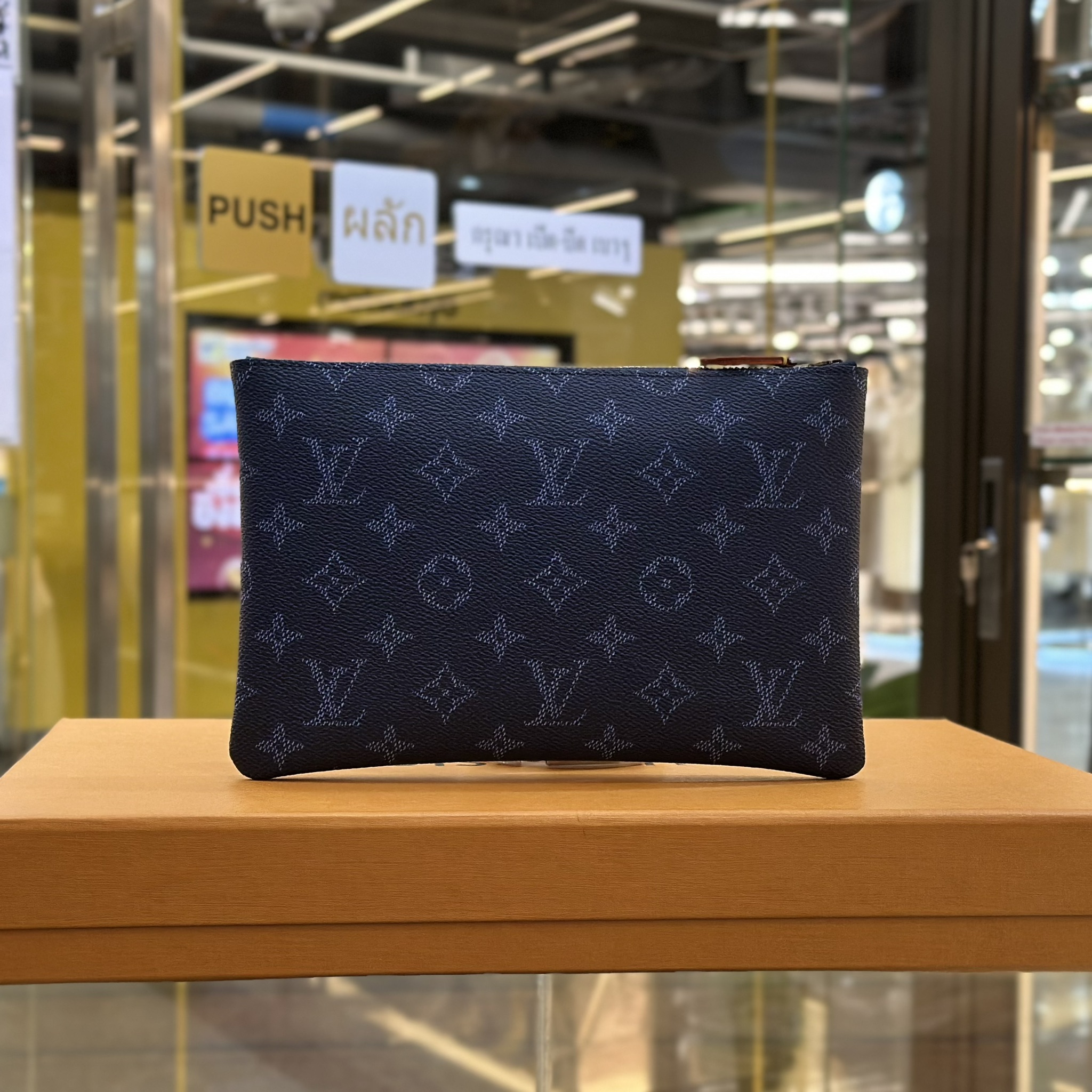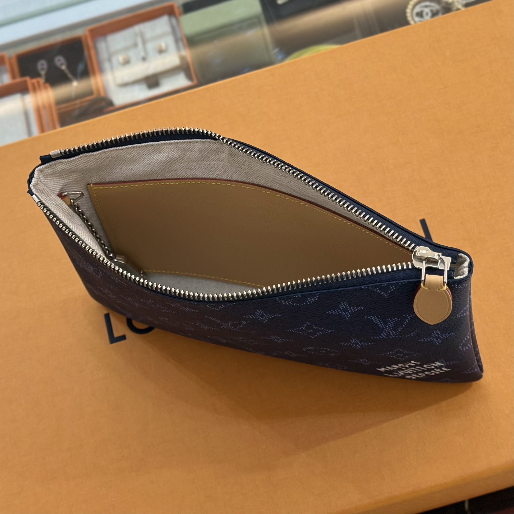 กระเป๋าเพาช์ซิปรูด จากแบรนด์ Louis Vuitton ดีไซน์เพรียวบาง ตกแต่งสายโซ่สีทองพร้อมตะขอเกี่ยว ภายในมีช่องสำหรับเก็บบัตร 1 ช่อง