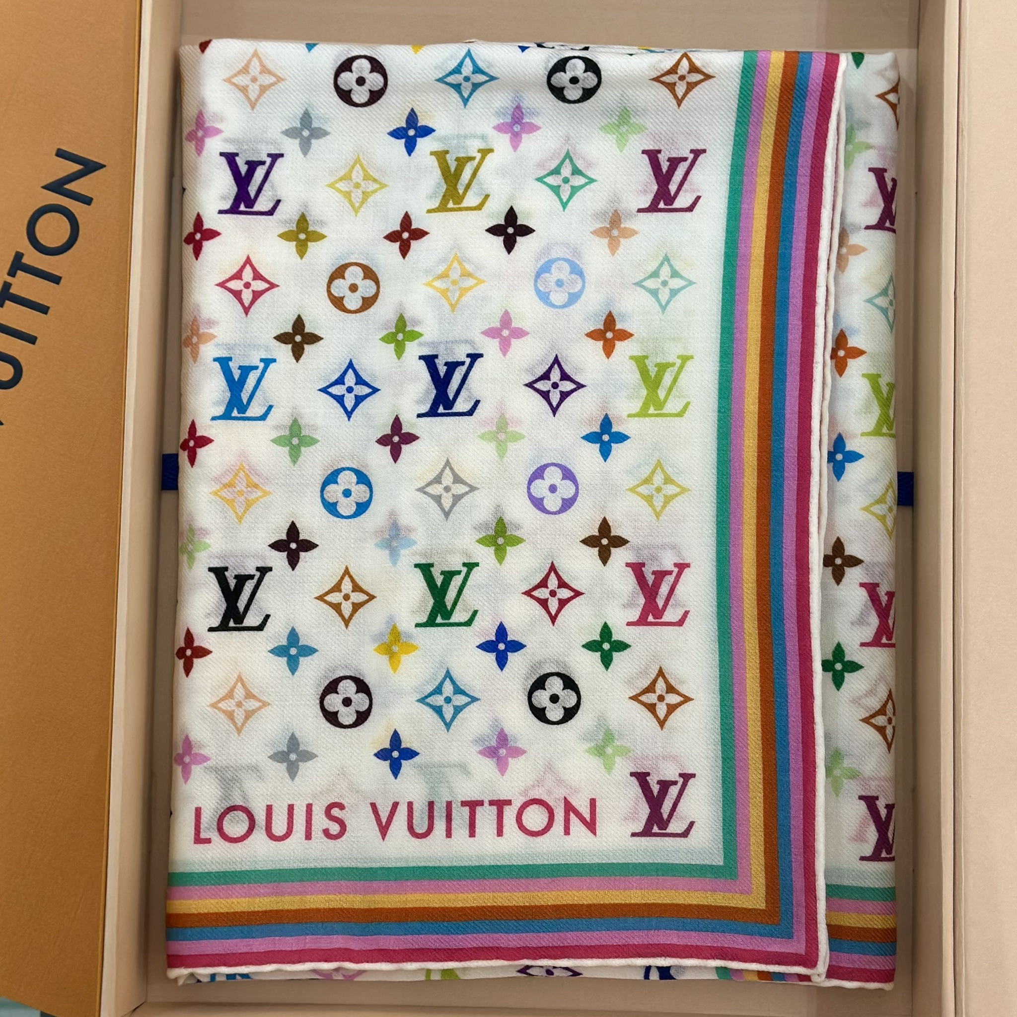 ผ้าพันคอ ผ้าคลุมไหล่ จากแบรนด์ Louis Vuitton คอลเล็กชั่น LV x TM ที่ได้ความร่วมมือจากศิลปินชาวญี่ปุ่นในการนำพาเลตต์ 33 เฉดสีมาตกแต่งลวดลาย Monogram ผ้ามีสัมผัสนุ่มสบาย น้ำหนักเบา เหมาะกับทุกฤดูกาล