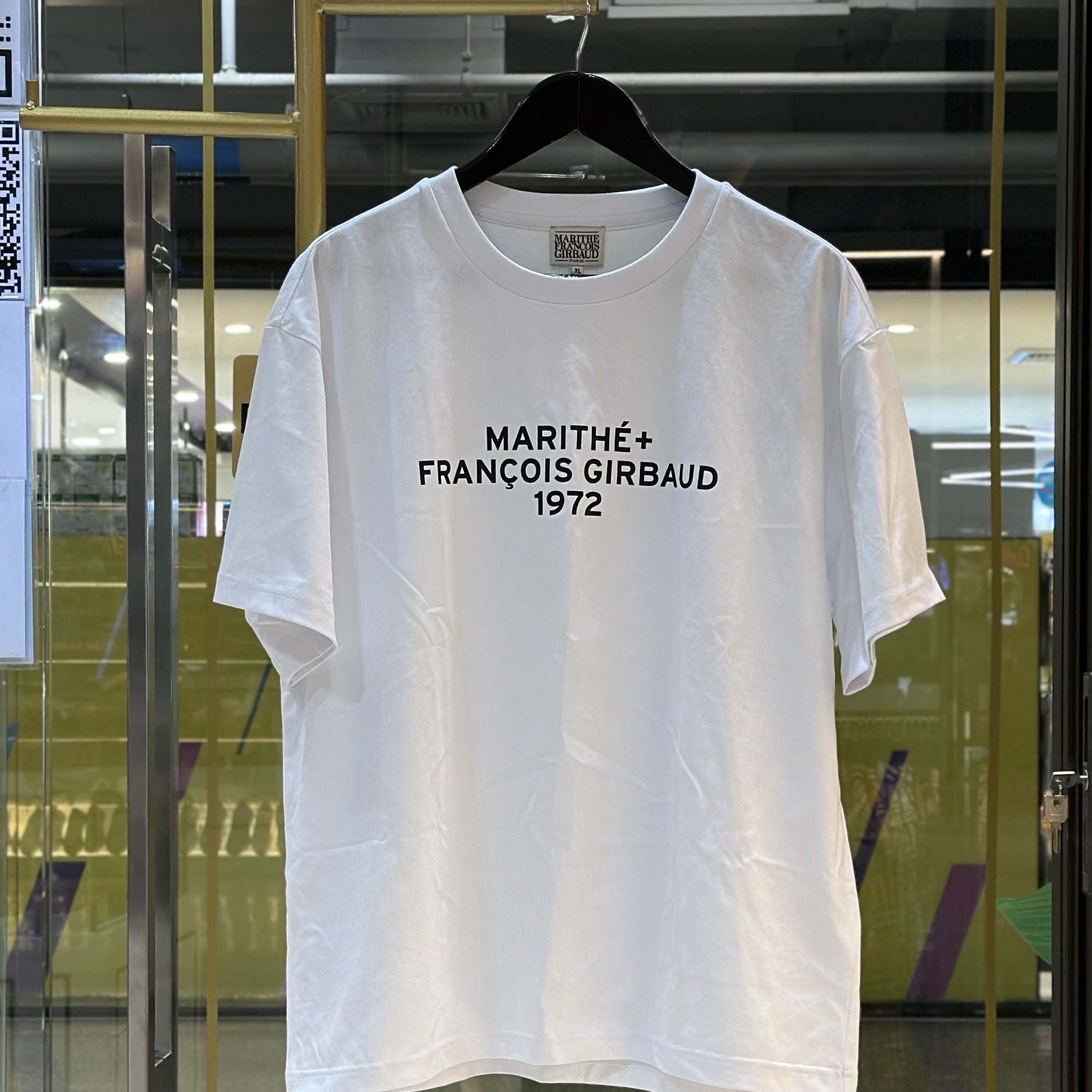 เสื้อยืดคอกลมแขนสั้น ทรงหลวม จากแบรนด์ Marithe Francois Girbaud พิมพ์ลายโลโก้แบบตัวพิมพ์ สไตล์มินิมอล ที่กลางอกเสื้อ