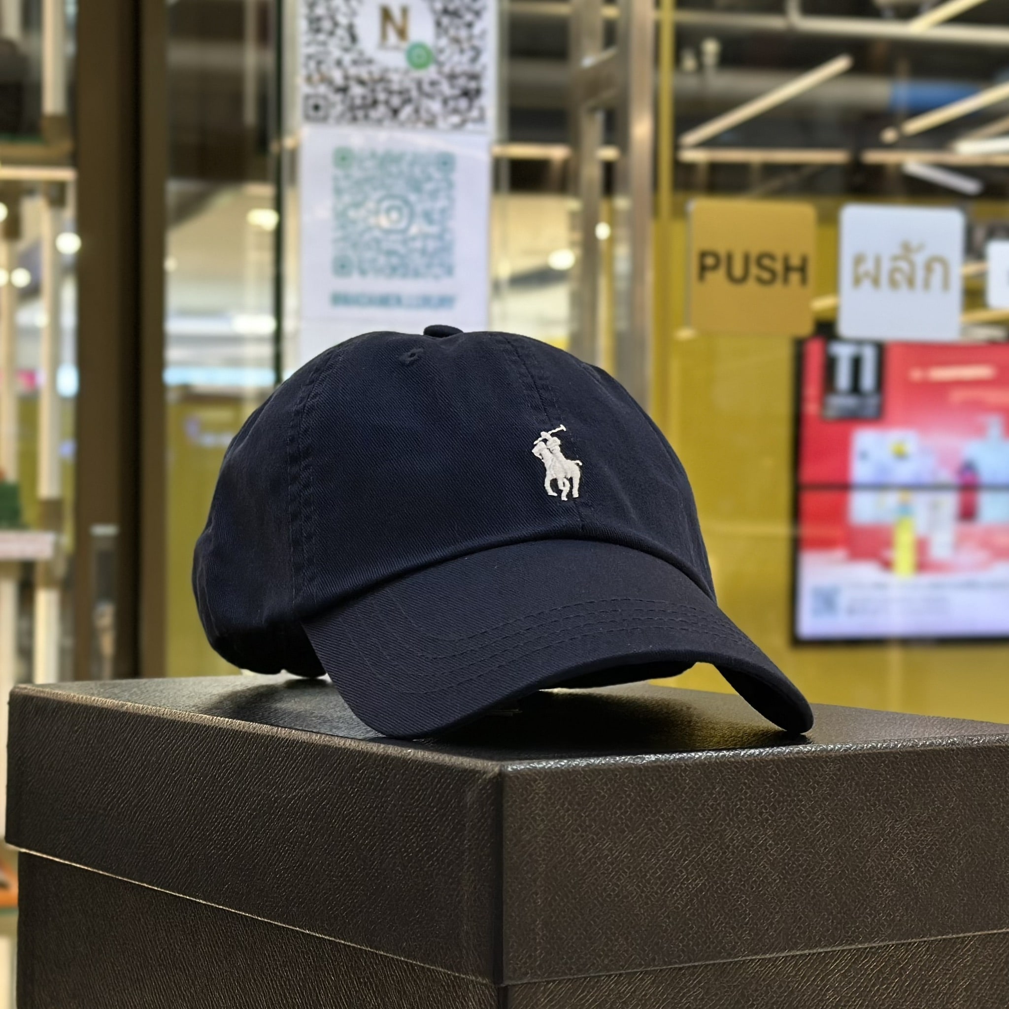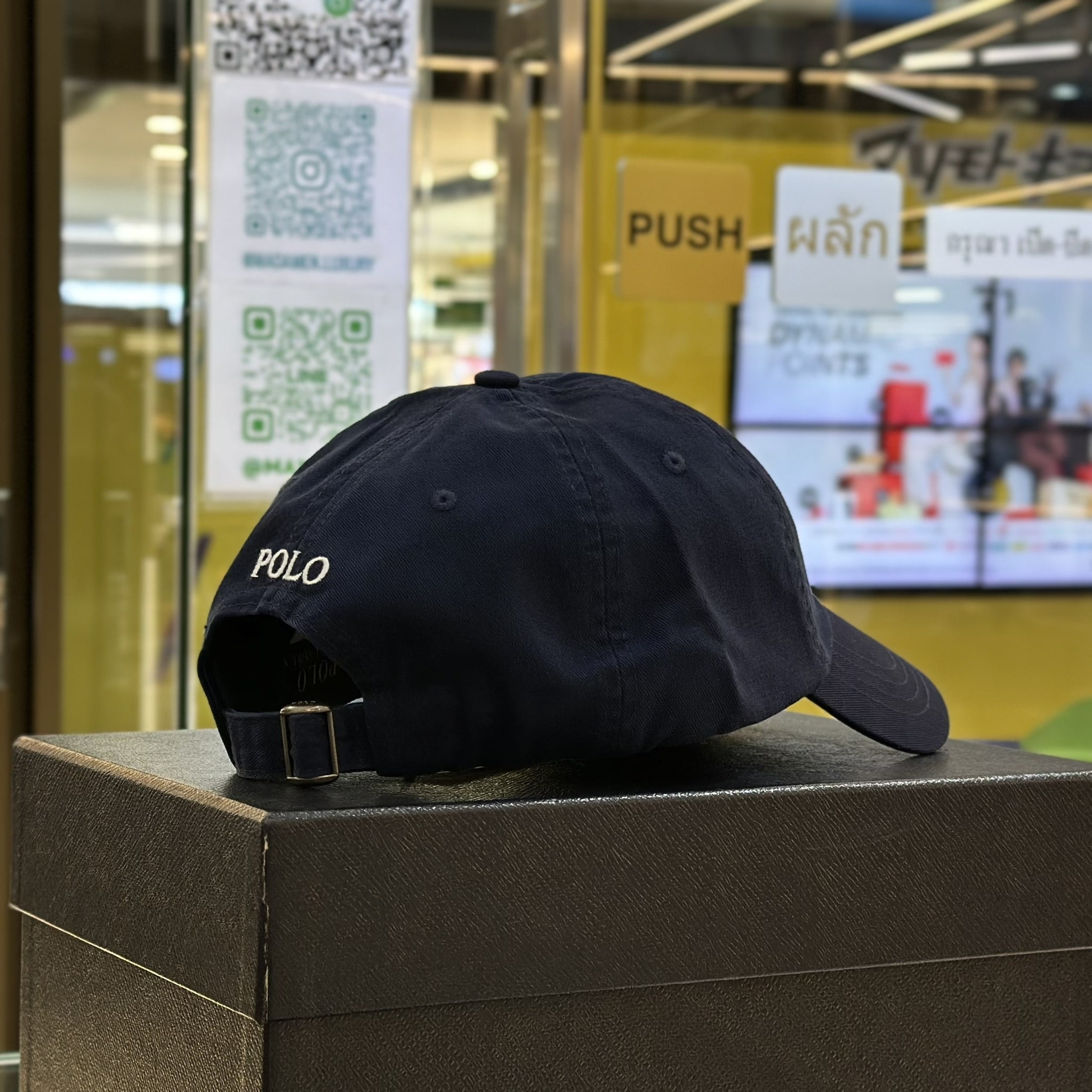 หมวกแก๊ปปรับขนาดได้ จากแบรนด์ Polo Ralph Lauren ด้านหน้าปักโลโก้ม้า Pony ขนาดเล็ก ด้านหลังปักคำว่า POLO