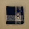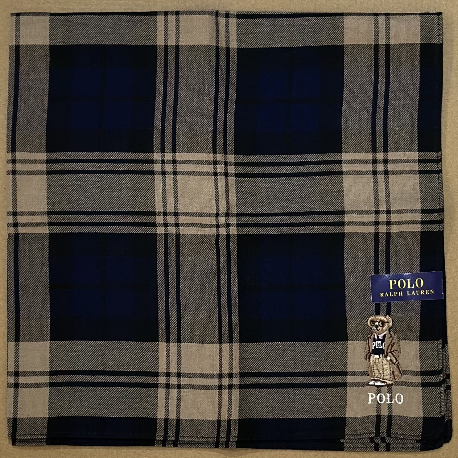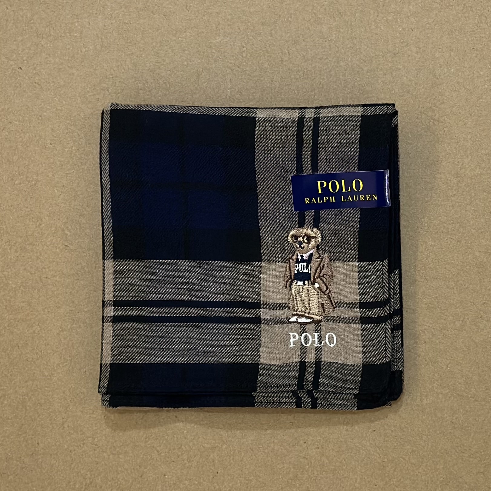 ผ้าเช็ดหน้าลายตาราง จากแบรนด์ Polo Ralph Lauren ปักลายหมี Polo Bear แต่งตัวแบบเรียบร้อย สวมเสื้อโค้ทและแว่นที่มุมผ้า