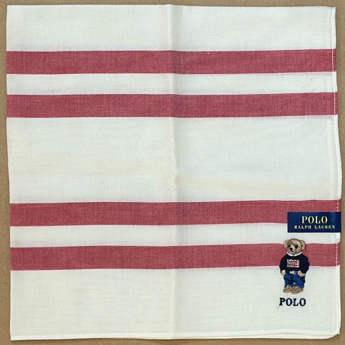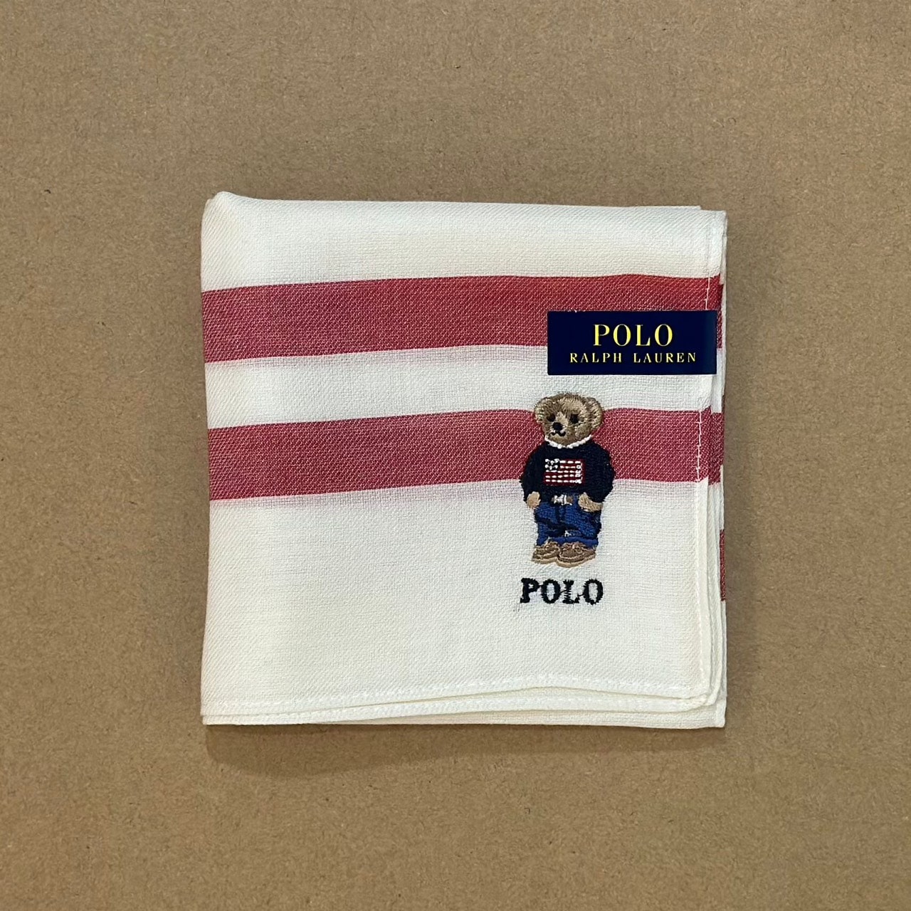 ผ้าเช็ดหน้าลายแถบคาด จากแบรนด์ Polo Ralph Lauren ปักลายหมี Polo Bear สวมเสื้อสเวตเตอร์ลายธงชาติสหรัฐ