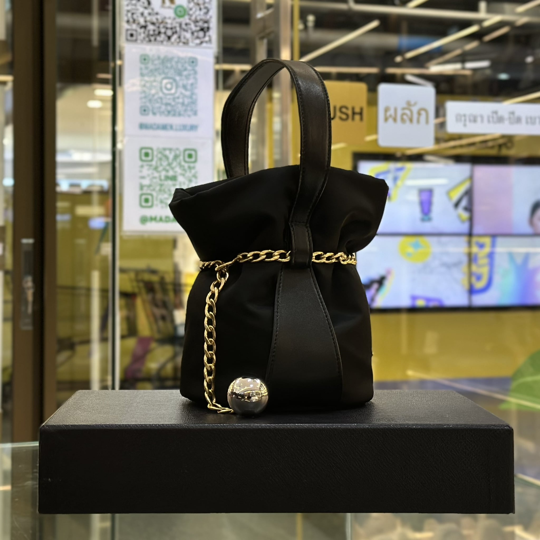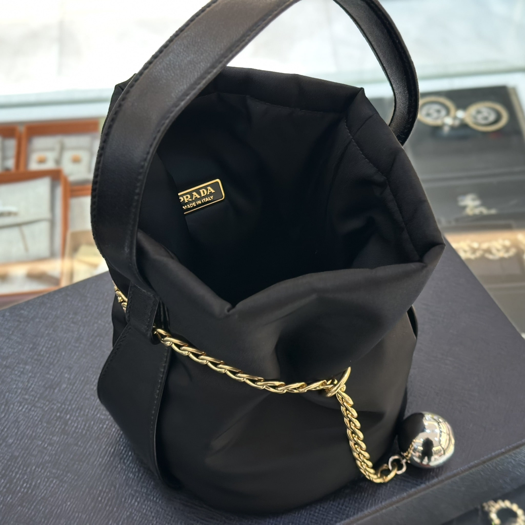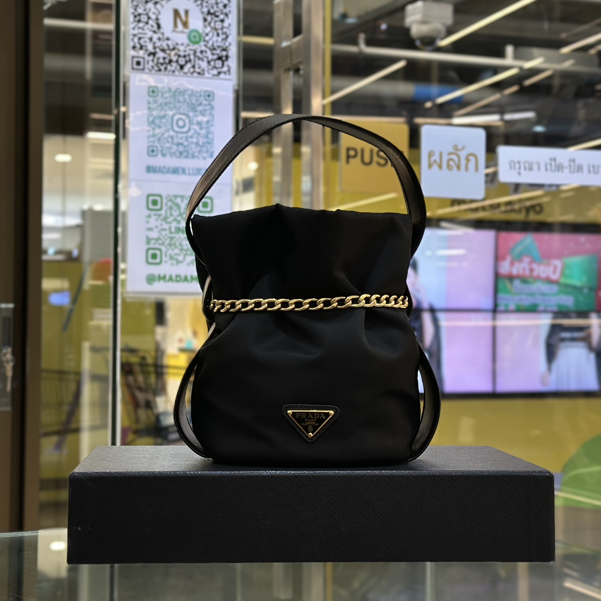 กระเป๋าบัคเก็ต สำหรับผู้หญิง จากแบรนด์ Prada มีหูหนังหิ้วและสายโซ่คล้องล้อมรอบซึ่งสามารถนำมาประยุกต์ใช้งานได้ ประดับโลโก้โลหะรูปทรงสามเหลี่ยมของแบรนด์