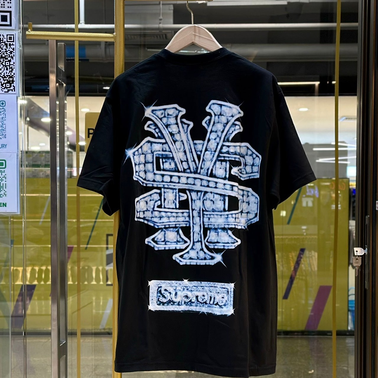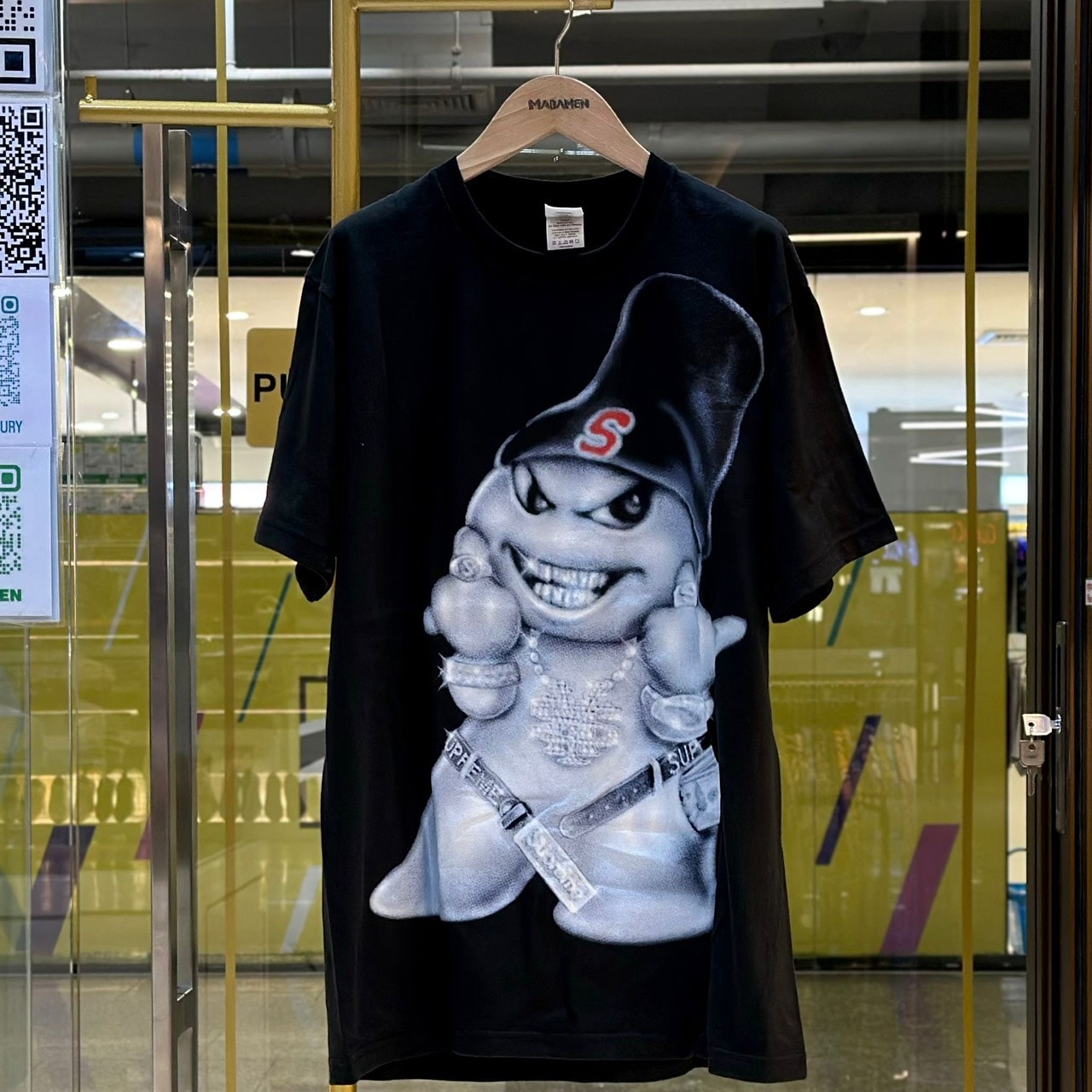 เสื้อยืดคอกลมแขนสั้น จากแบรนด์ Sureme พิมพ์ลายตุ๊กตาหิมะที่สวมหมวกที่มีอักษรย่อของแบรนด์และเครื่องประดับหรูหรา ด้านหลังพิมพ์ลายจี้สร้อยคอที่ตุ๊กตาหิมะตัวนี้สวมอยู่