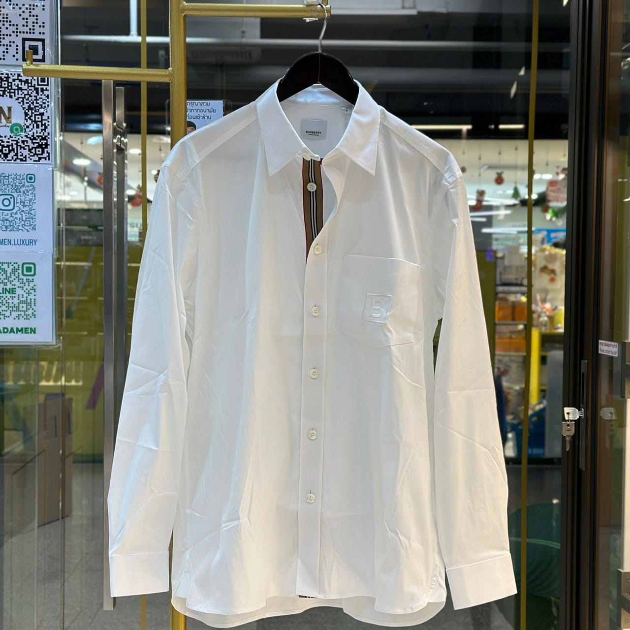 เสื้อเชิ้ตแขนยาว จากแบรนด์ Burberry ปักโลโก้อักษรย่อตัว B ในกรอบสี่เหลี่ยมที่กระเป๋าเสื้อ ตกแต่งลายแถบคาดตามแนวด้านกระดุม