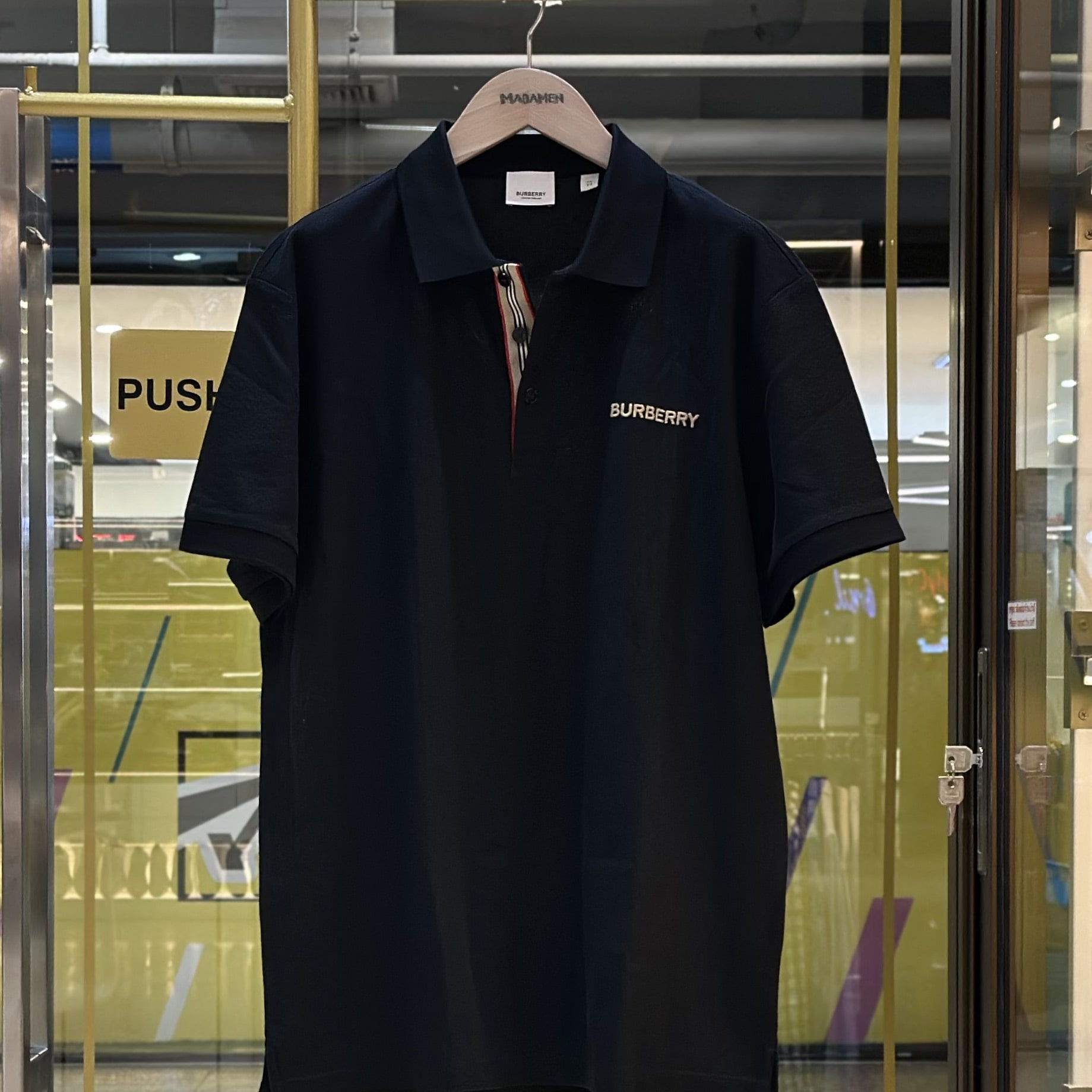 เสื้อยืดคอปกโปโล จากแบรนด์ Burberry ปักชื่อแบรนด์ที่บริเวณอกเสื้อ ตกแต่งลายแถบตามแนวกระดุมเสื้อ