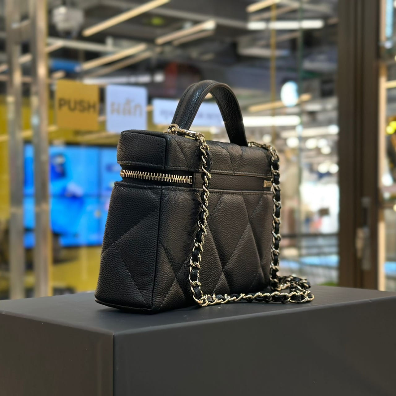 กระเป๋าถือพร้อมสายสะพายโซ่ สำหรับผู้หญิง จากแบรนด์ Chanel รูปทรงกล่องขนาดเล็ก เปิด-ปิดด้วยซิปรอบ ด้านหน้าประดับโลโก้ CC สีทอง