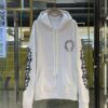 เสื้อฮู้ด จากแบรนด์ Chrome Hearts พิมพ์ลายโลโก้เกือกม้าที่บริเวณอกเสื้อและด้านหลังเสื้อ บริเวณแขนเสื้อตกแต่งลายกางเขนสีดำทับซ้อนกัน