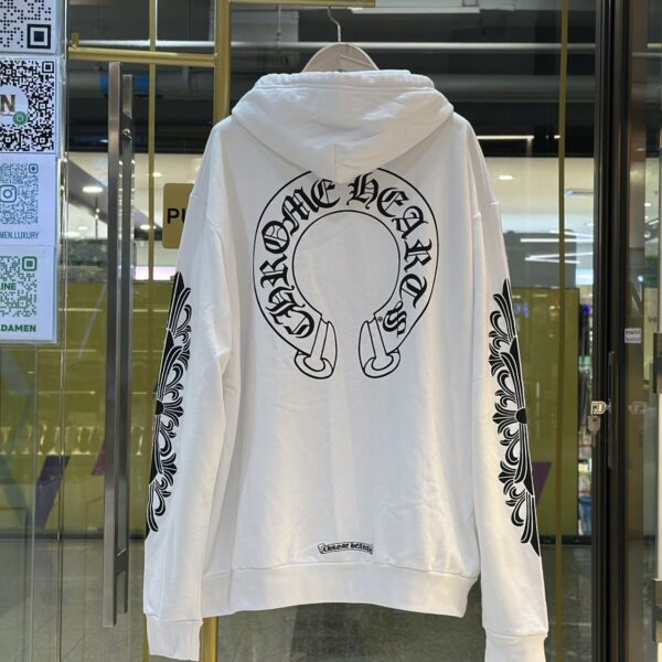 เสื้อฮู้ด จากแบรนด์ Chrome Hearts พิมพ์ลายโลโก้เกือกม้าที่บริเวณอกเสื้อและด้านหลังเสื้อ บริเวณแขนเสื้อตกแต่งลายกางเขนสีดำทับซ้อนกัน