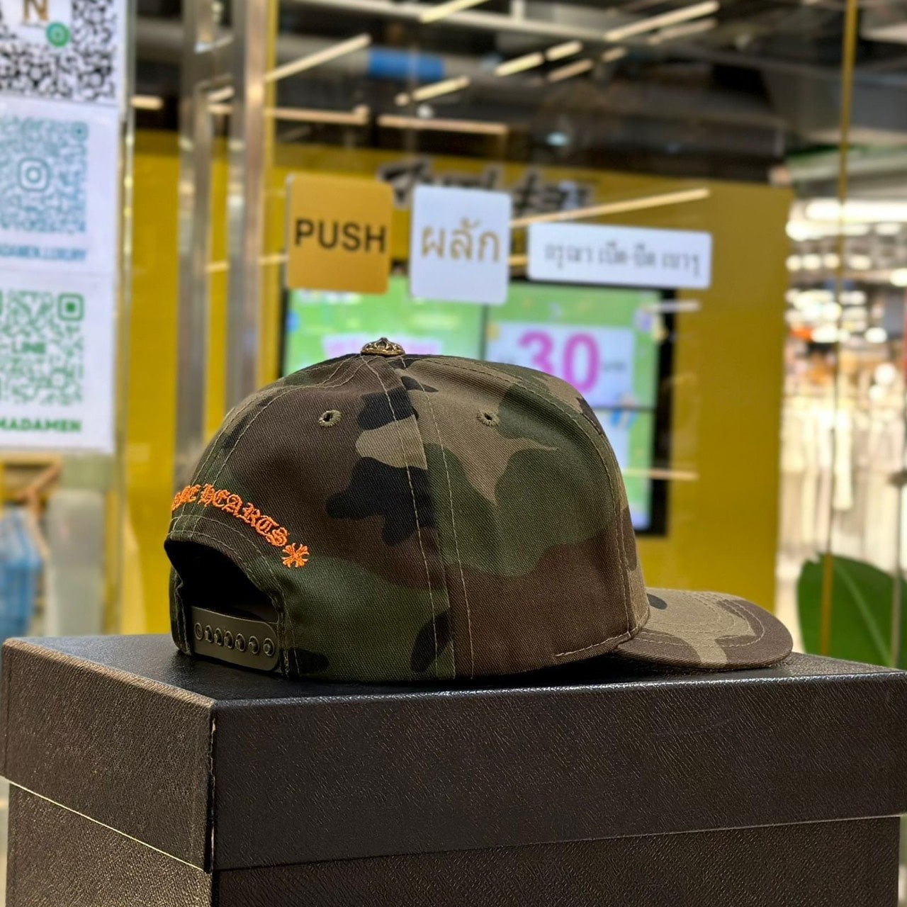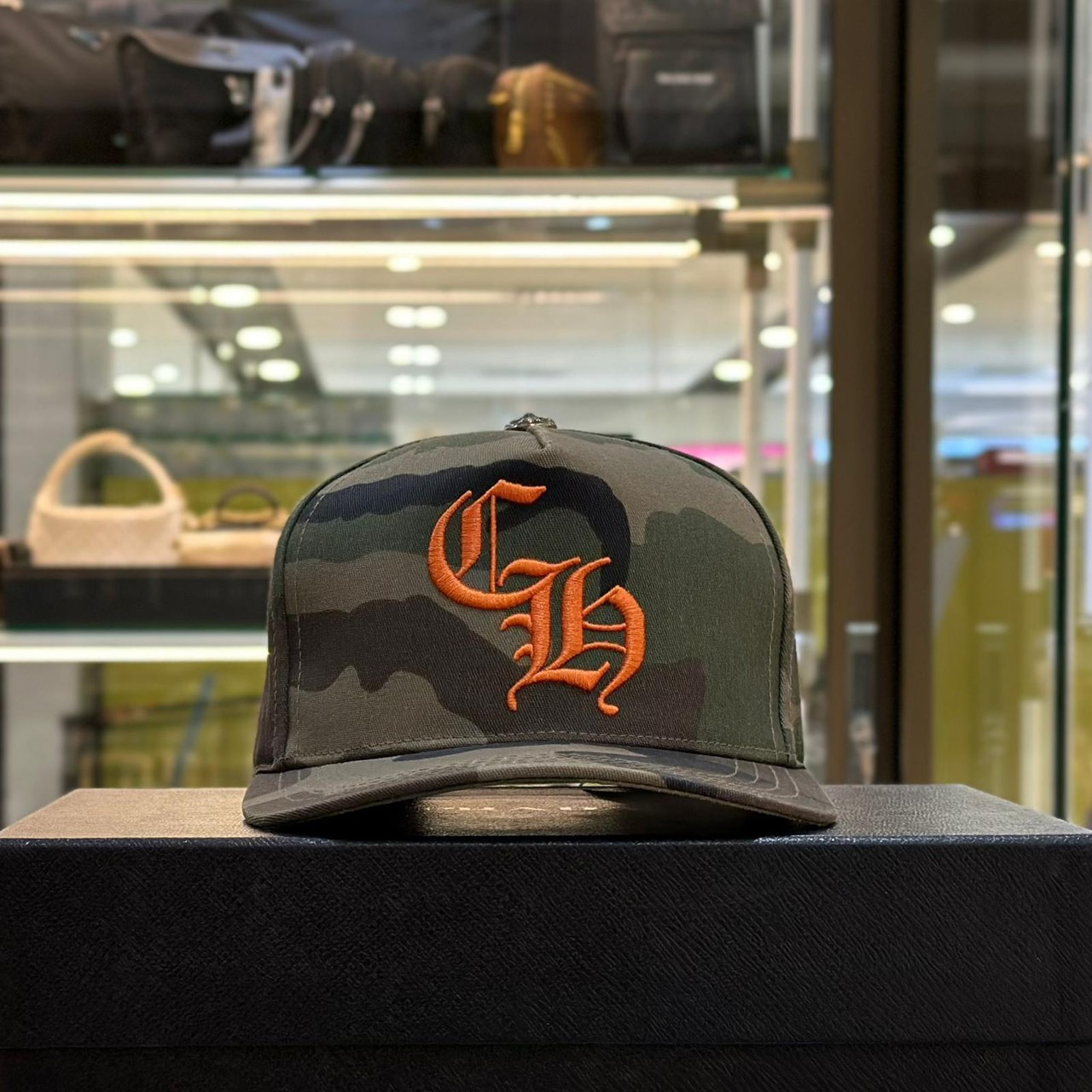 หมวกแก๊ปลายพรางทหาร จากแบรนด์ Chrome Hearts ปักอักษรย่อ CH ของแบรนด์ที่ด้านหน้า