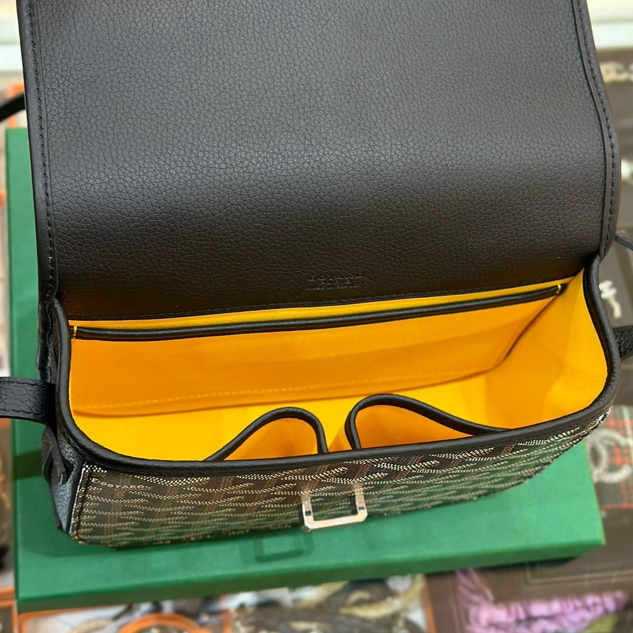 กระเป๋าสะพายข้าง Goyard รุ่น Belvedere เปิด-ปิดด้วยฝาพับที่มีช่องสำหรับล็อคด้วยสายหนัง ด้านในมีช่องใส่ของแยก