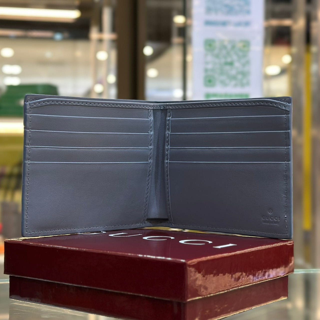 กระเป๋าสตางค์แบบพับ สำหรับผู้ชาย จากแบรนด์ Gucci ติดสัญลักษณ์ GG ที่ด้านหน้า ภายในมีช่องใส่บัตร 8 ช่อง