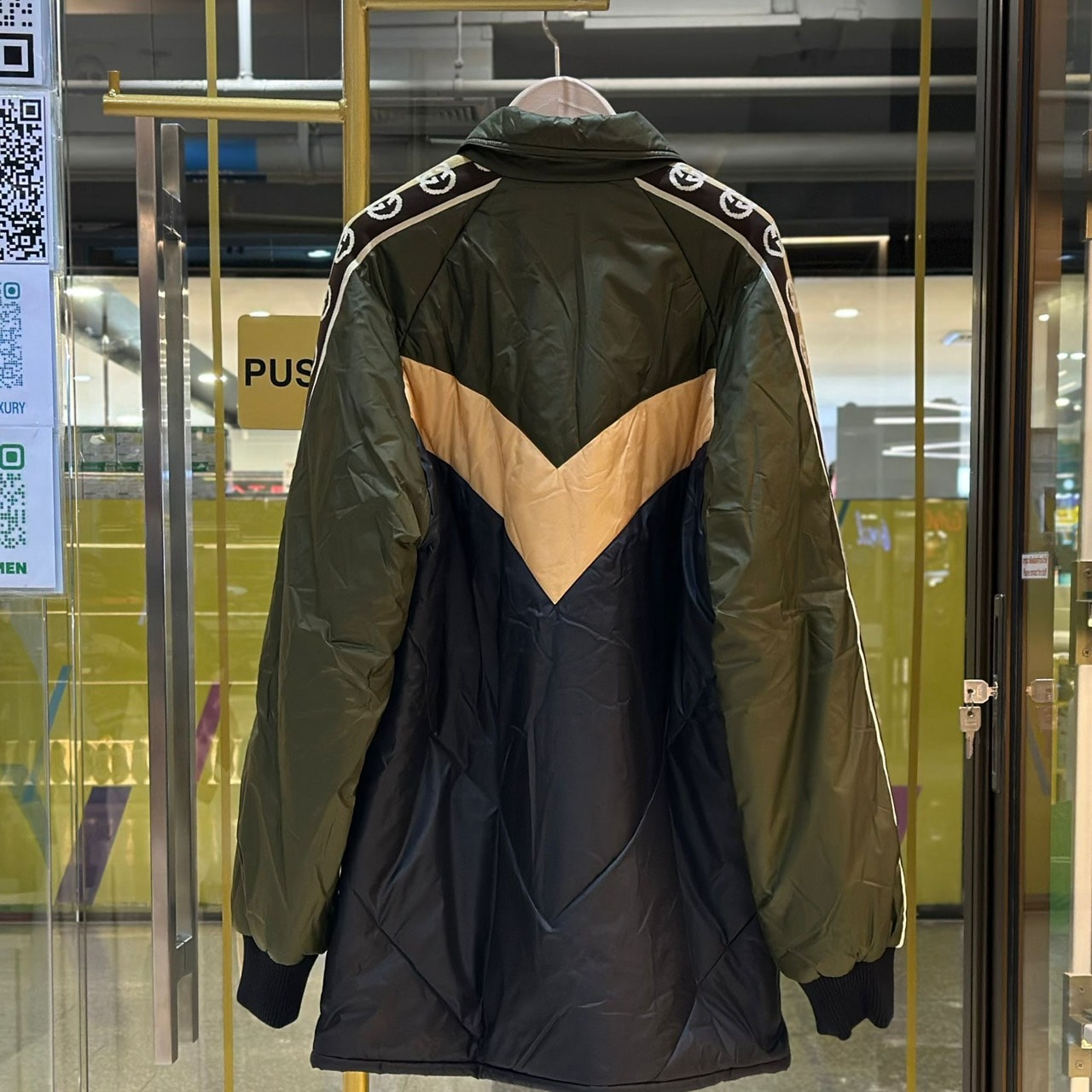 เสื้อแจ็คเก็ตซิปรูด จากแบรนด์ Gucci ผลิตจากผ้าร่ม แต่ยังคงให้ความอบอุ่น ตกแต่งบริเวณแนวแขนเสื้อด้วยลาย GG