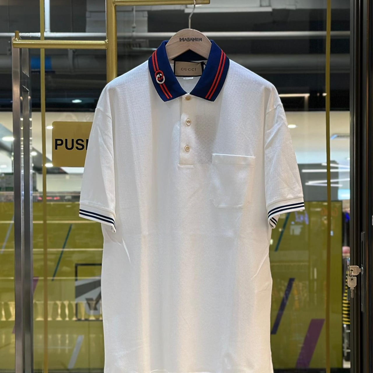 เสื้อยืดคอปกโปโลแขนสั้น สำหรับผู้ชาย จากแบรนด์ Gucci คอปกกับปลายแขนเสื้อตกแต่งด้วยลาย Web สีน้ำเงิน ด้านขวาของปกเสื้อปักลายโลโก้ Interlocking G