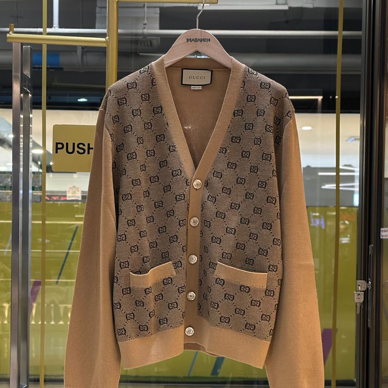 เสื้อคาร์ดิแกน จากแบรนด์ Gucci ถักลวดลาย GG อันเป็นเอกลักษณ์ของแบรนด์ มีกระเป๋าด้านหน้า 2 ข้าง