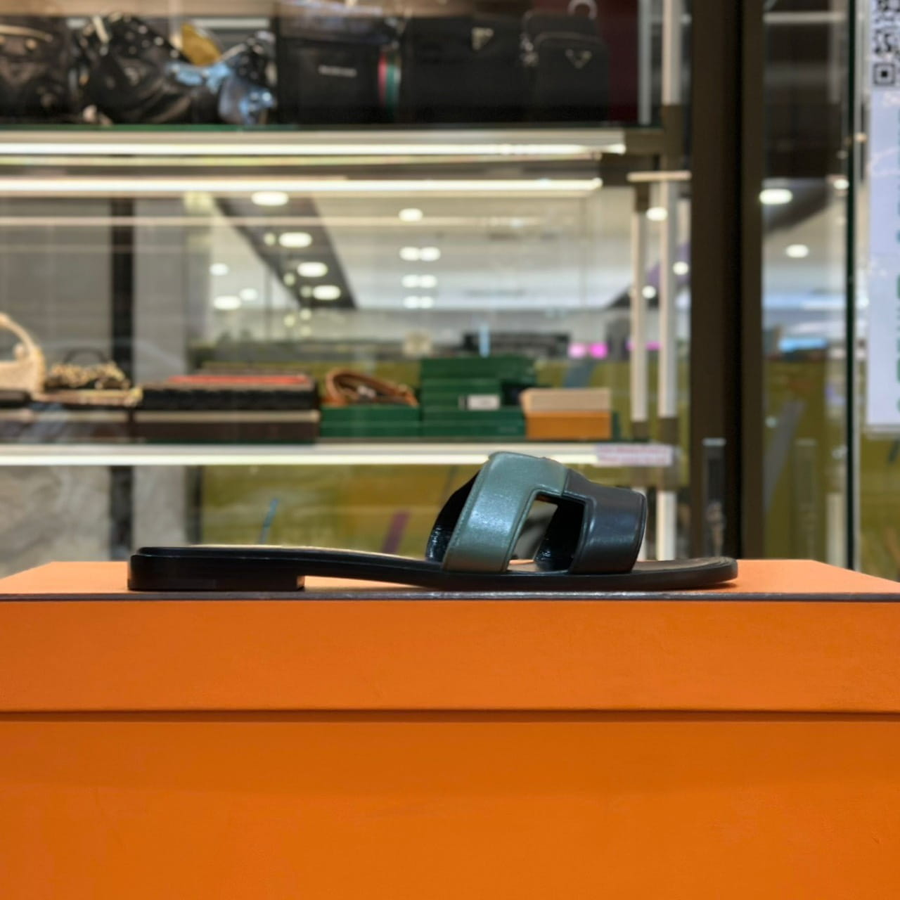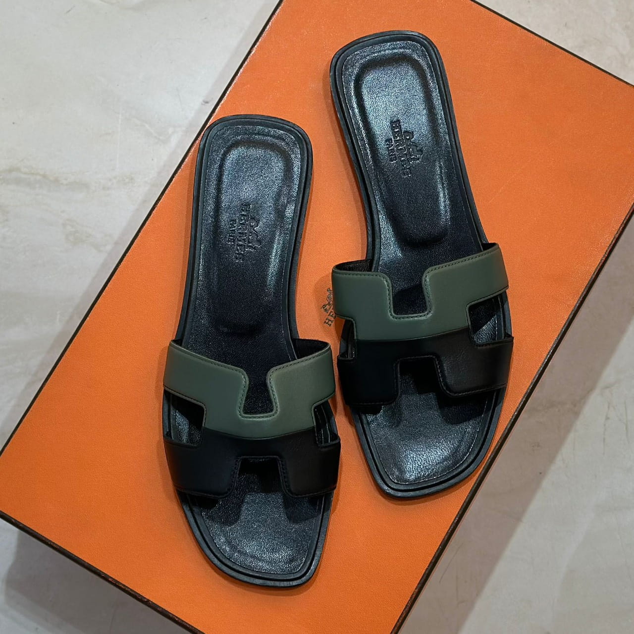 รองเท้าแตะผู้หญิงพื้นราบ จากแบรนด์ Hermes สายคาดหนัง หน้าตัดรูปทรงตัว H สุดไอคอนิก แบบแบ่งครึ่งสองเฉดสี