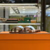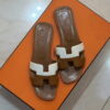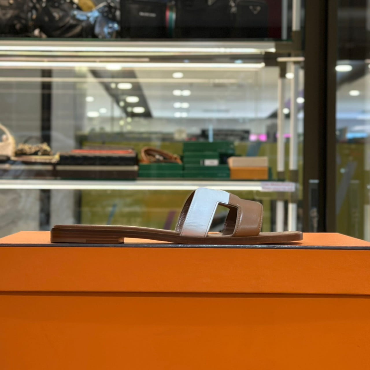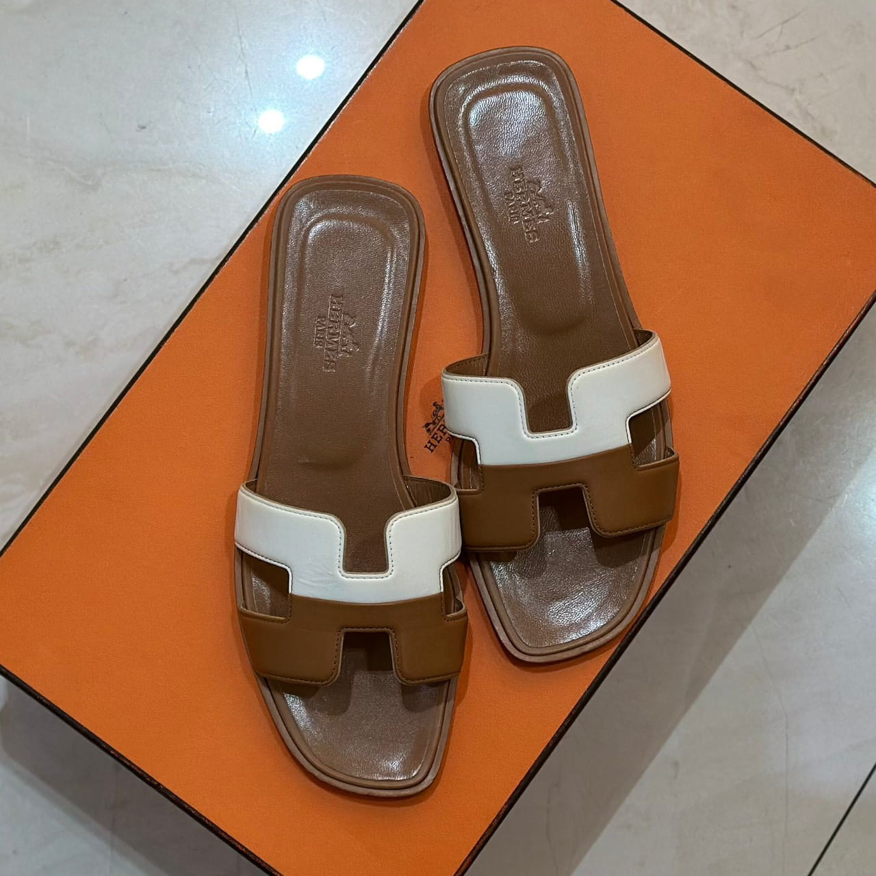 รองเท้าแตะผู้หญิงพื้นราบ จากแบรนด์ Hermes สายคาดหนัง หน้าตัดรูปทรงตัว H สุดไอคอนิก แบบแบ่งครึ่งสองเฉดสี