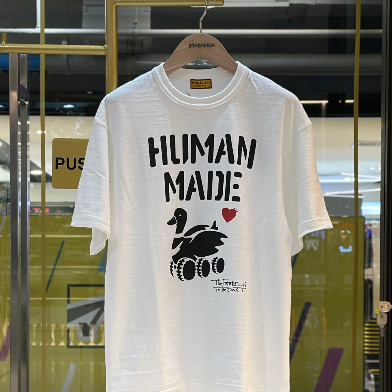 เสื้อยืดคอกลมแขนสั้น จากแบรนด์ Human Made พิมพ์ลายกราฟฟิคเป็ดติดล้อ พร้อมกับโลโก้สุดไอคอนิกแบบต่าง ๆ ของแบรนด์