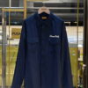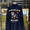 เสื้อเชิ้ตแขนยาว จากแบรนด์ Human Made ปักโลโก้แบรนด์สีขาวที่อกเสื้อ ด้านหน้ามีกระเป๋าเสื้อสองข้าง ด้านหลังพิมพ์ลายกราฟฟิคสุนัขในชุดเอี๊ยมผ้าเดนิม