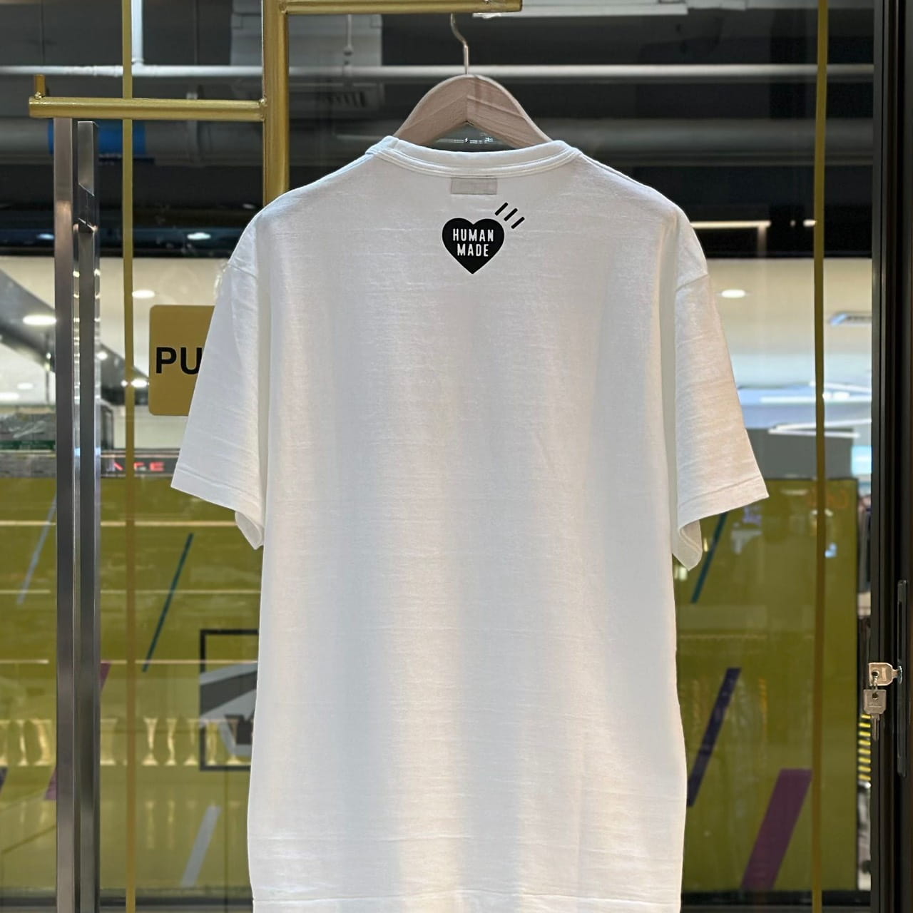 เสื้อยืดคอกลมแขนสั้น จากแบรนด์ Human Made พิมพ์ลายกราฟฟิคเป็ดขนาดใหญ่พร้อมชื่อแบรนด์ที่ด้านหน้า และพิมพ์ลายโลโก้หัวใจขนาดเล็กที่บริเวณด้านหลังคอเสื้อ