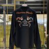 เสื้อเชิ้ตแขนยาว จากแบรนด์ Human Made ด้านหน้าปักลายหัวใจ ด้านหลังปักลายมังกรคู่ กับวลี The future is in the past