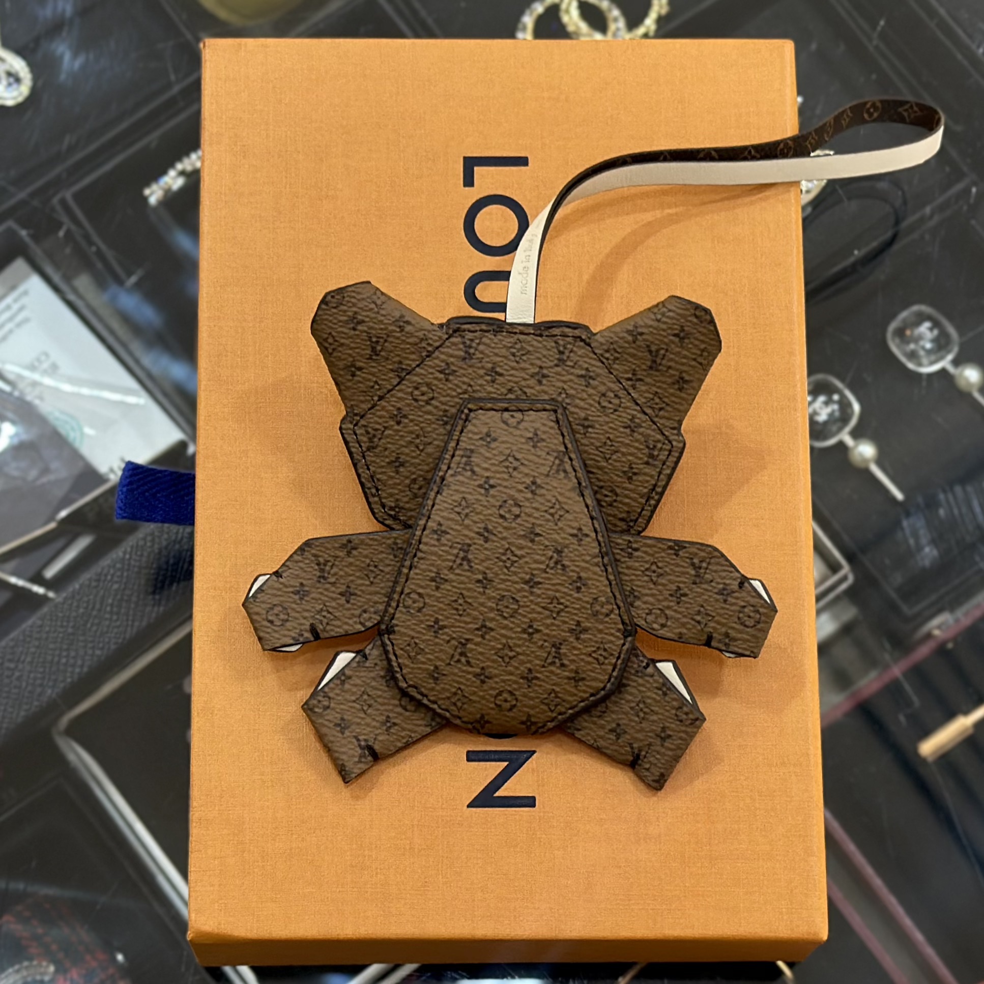 ชาร์มหนังสำหรับห้อยกระเป๋า จากแบรนด์ Louis Vuitton รุ่น LV Origami Friend Teddy Bear รูปทรงหมีลาย Monogram โดยได้แรงบันดาลใจมาจากศิลปะกาารพับกระดาษโอริกามิ ตกแต่งดวงตา Monogram Flower สีแดง