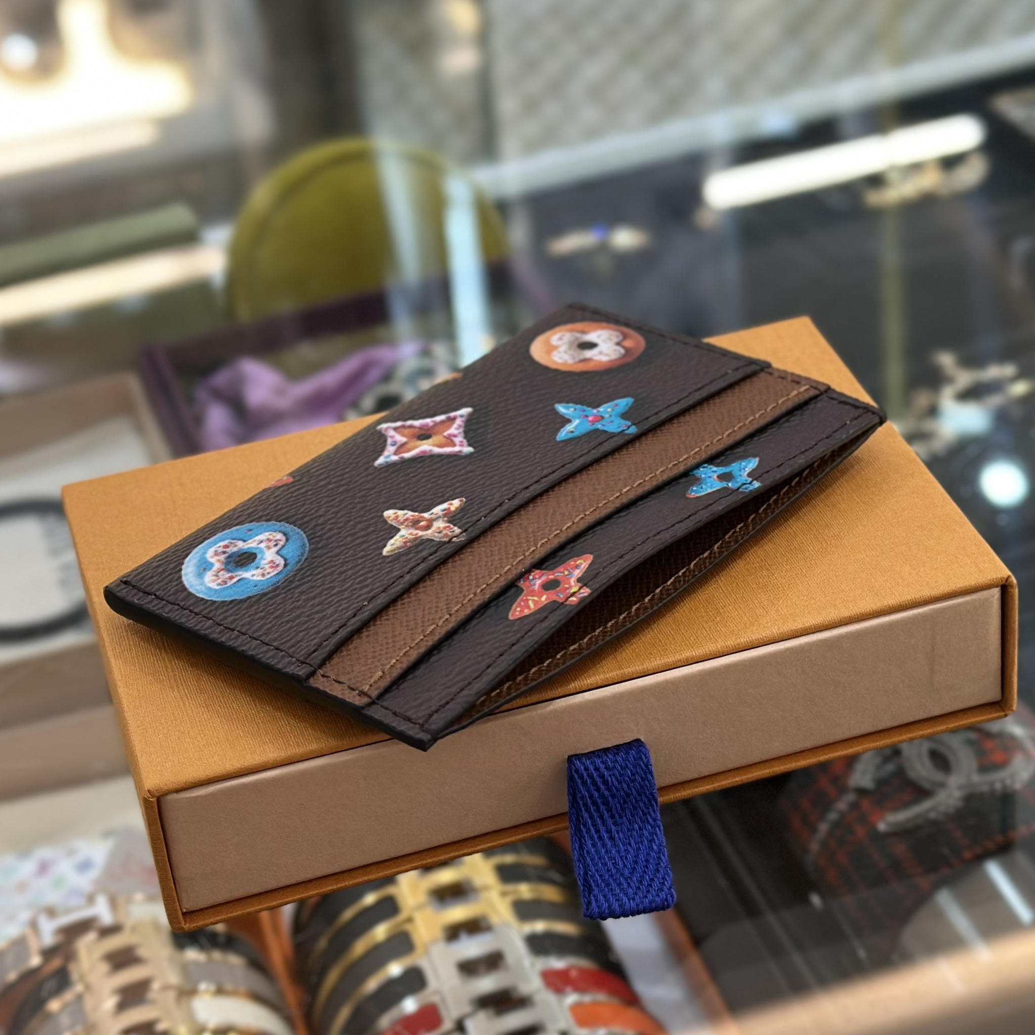 กระเป๋าใส่บัตร จากแบรนด์ Louis Vuitton ที่แต่งแต้มรูปทรงโดนัทชิ้นเล็กๆ ลงไปรอบด้าน มีช่องใส่บัตรทั้งสองด้านรวม 4 ช่อง และช่องกระเป๋าตรงกลางอีก 1 ช่อง ช่วยให้แบ่งใช้งานได้อย่างสะดวกสบาย