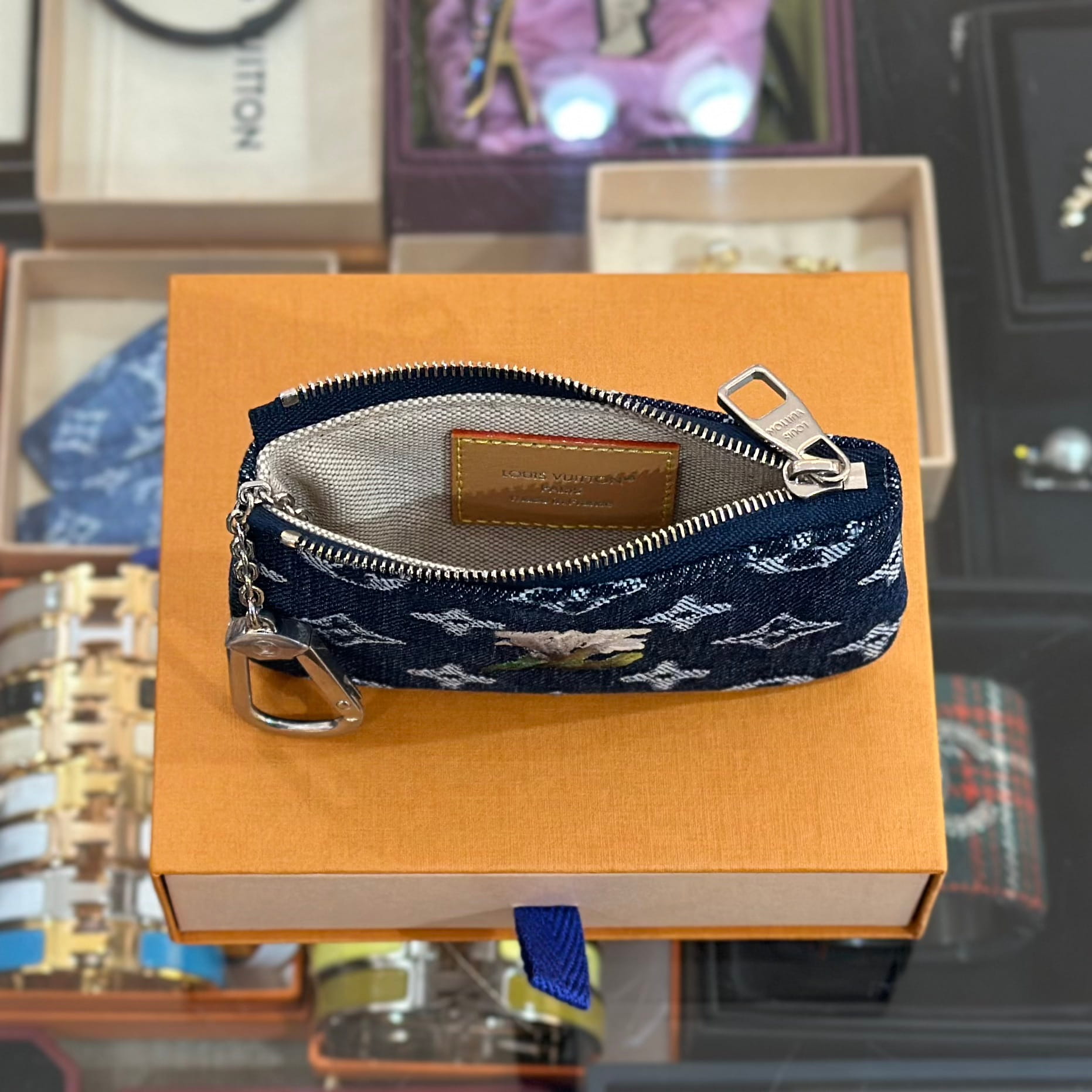 กระเป๋าเพาช์ซิปสำหรับใส่กุญแจ จากแบรนด์ Louis Vuitton ดีไซน์สไตล์ผ้าเดนิม ตกแต่งดีเทลลายปักดอกไม้ มีขอเกี่ยวและสายโซ่สีเงิน ช่องภายในสามารถใช้เก็บเหรียญและบัตรได้