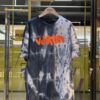 เสื้อยืดคอกลมแขนสั้น จากแบรนด์ Louis Vuitton ดีไซน์สตรีท ลงสีสไตล์การมัดย้อมแบบไม่สมมาตร พิมพ์คำว่า Vuitton สีส้มสดที่กลางอกเสื้อ