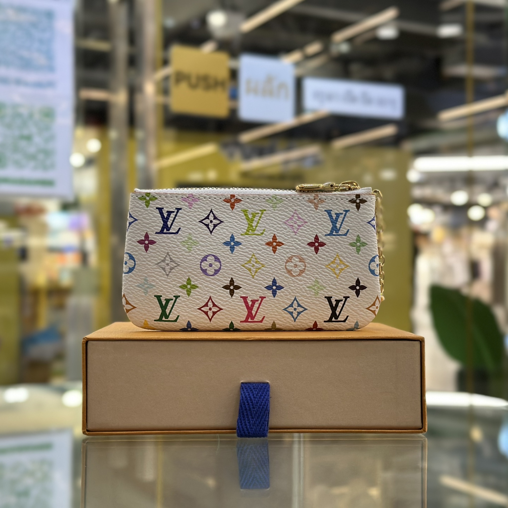 กระเป๋าเพาช์ซิปสำหรับใส่กุญแจ จากแบรนด์ Louis Vuitton คอลเล็กชั่นพิเศษ LV x TM 130th Monogram Anniversary ที่นำลวดลาย Monogram สีสันสดใสกลับมาอีกครั้ง พร้อมด้วยสายโซ่สีทองและตะขอเกี่ยวที่มอบลุคหรูหรา ช่องภายในสามารถใช้เก็บเหรียญและบัตรได้