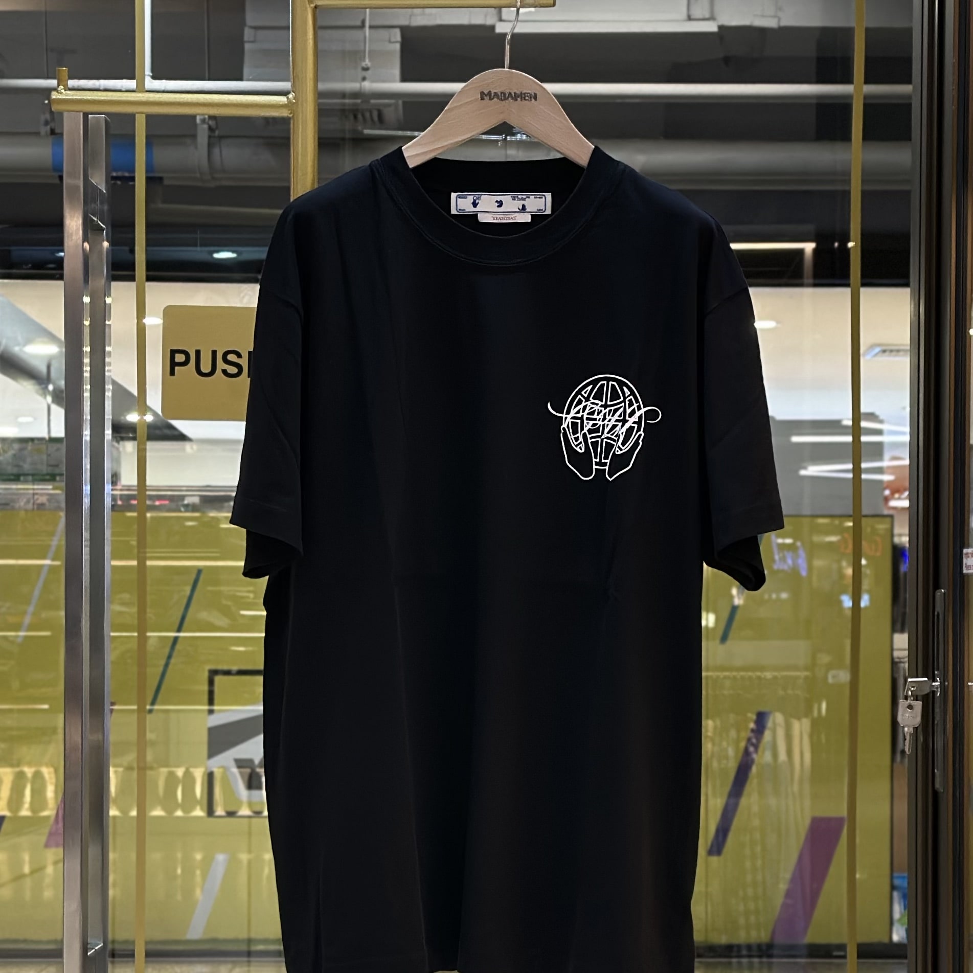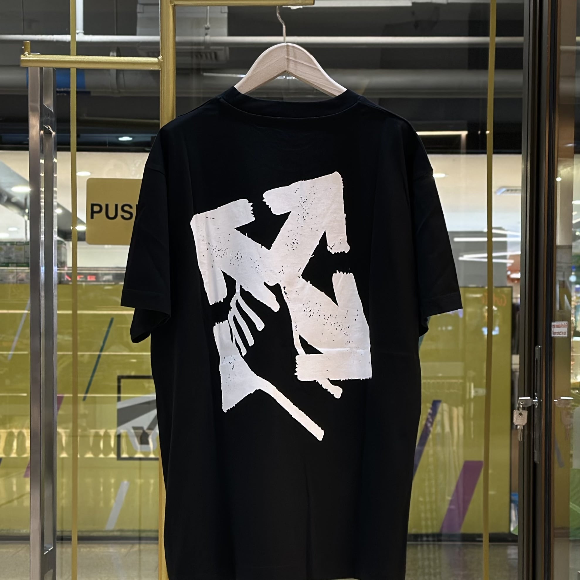 เสื้อยืดคอกลมแขนสั้น ทรงหลวม จากแบรนด์ Off-White พิมพ์ลายมืออุ้มลูกทรงกลม ด้านหลังพิมพ์ลายลูกศรแบบสีสเปรย์ขาว