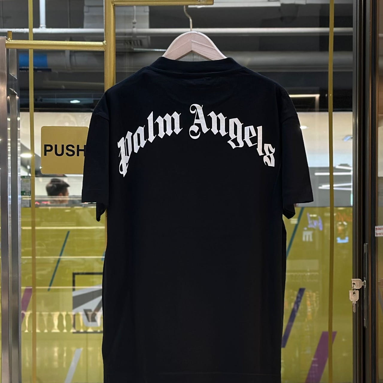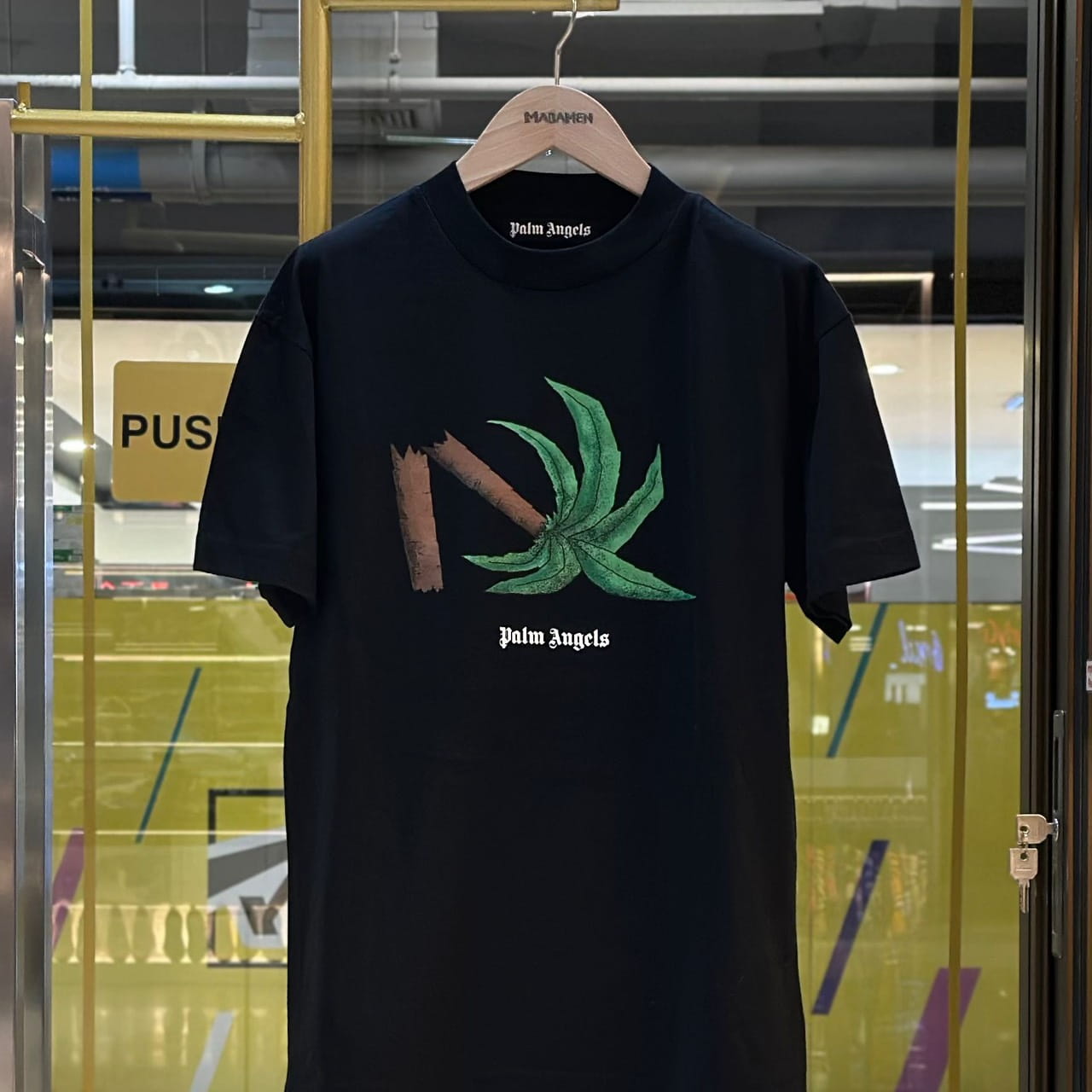เสื้อยืดคอกลมแขนสั้น จากแบรนด์ Palm Angels ด้านหน้าพิมพ์ลายต้นปาล์มหัก ด้านหลังพิมพ์ลายโลโก้ของแบรนด์