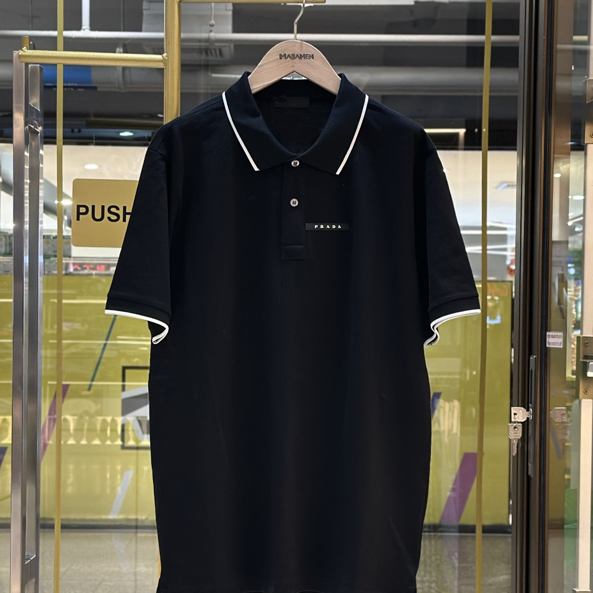 เสื้อยืดคอปกโปโล จากแบรนด์ Prada ติดป้ายชื่อแบรนด์ที่ด้านข้างแนวกระดุม