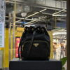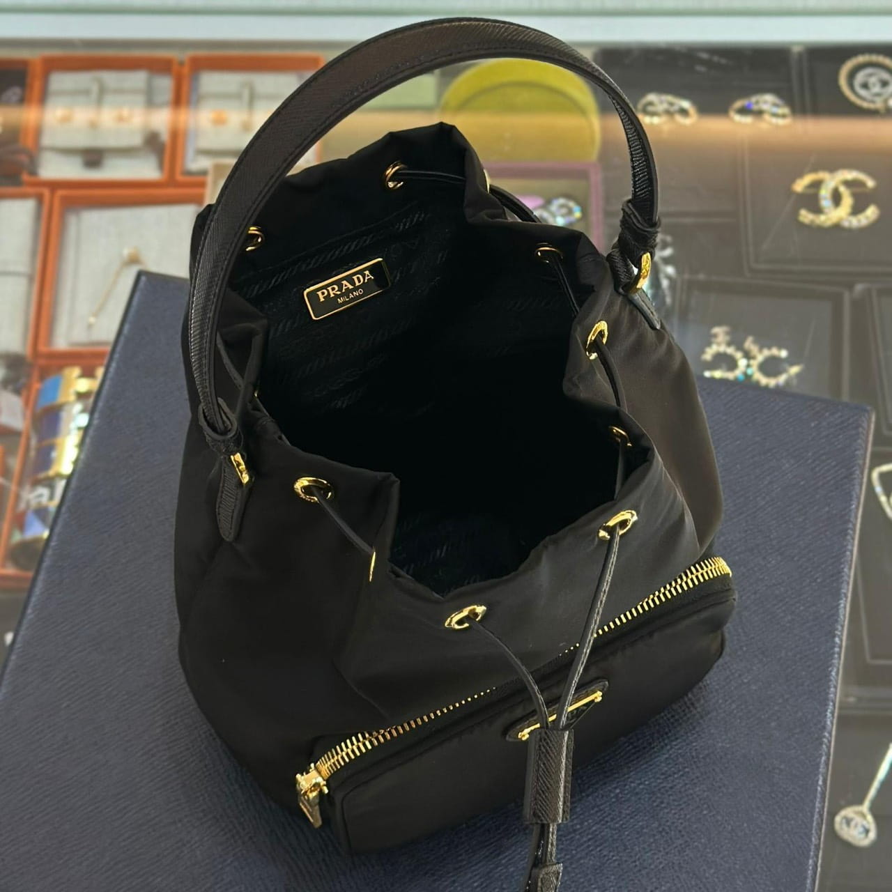 กระเป๋าบัคเก็ต จากแบรนด์ Prada เปิด-ปิดช่องกระเป๋าหลักด้วยสายดึงแบบย่าม มีช่องซิปแยกด้านนอก ซึ่งติดโลโก้โลหะสามเหลี่ยมของแบรนด์