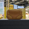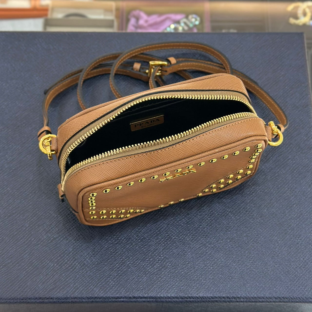 กระเป๋าสะพายหนัง จากแบรนด์ Prada ประดับหมุดสีทองรอบด้านในสไตล์วินเทจ