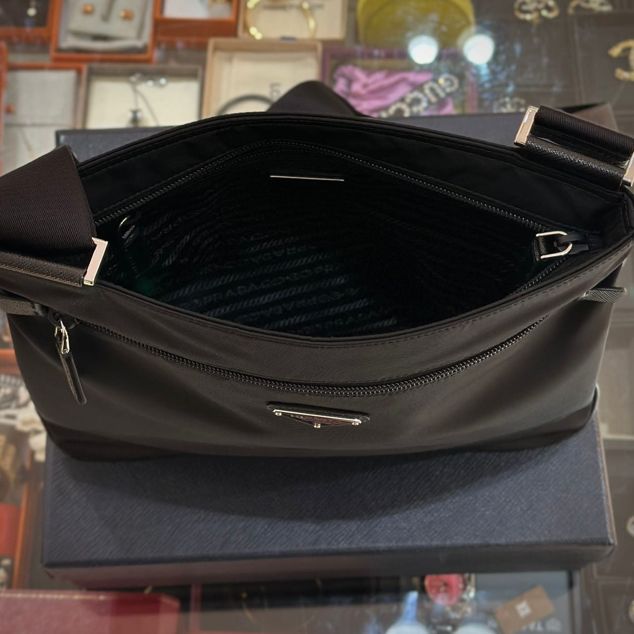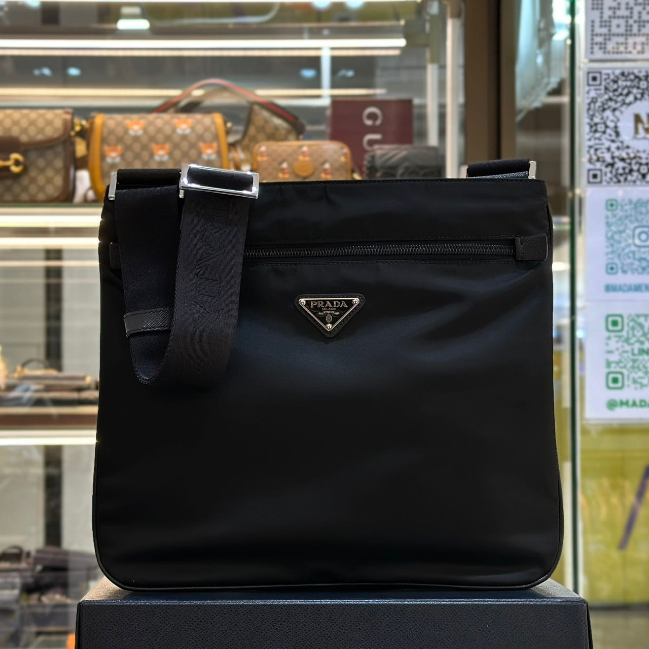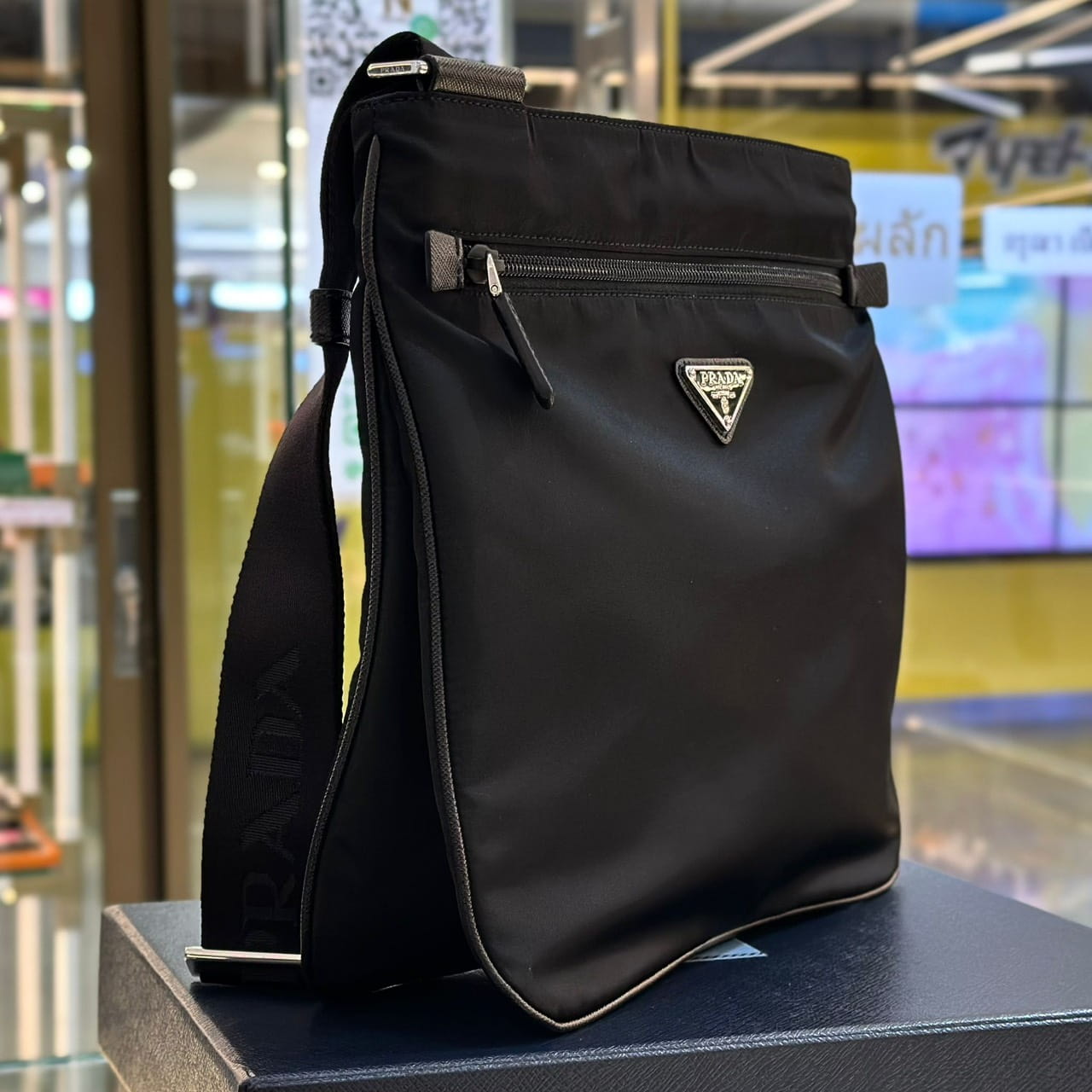 กระเป๋าแมสเซนเจอร์ สำหรับผู้ชาย จากแบรนด์ Prada รูปทรงแบนเรียบ ด้านหน้าติดโลโก้โลหะรูปทรงสามเหลี่ยมของแบรนด์ และมีช่องซิปแยก
