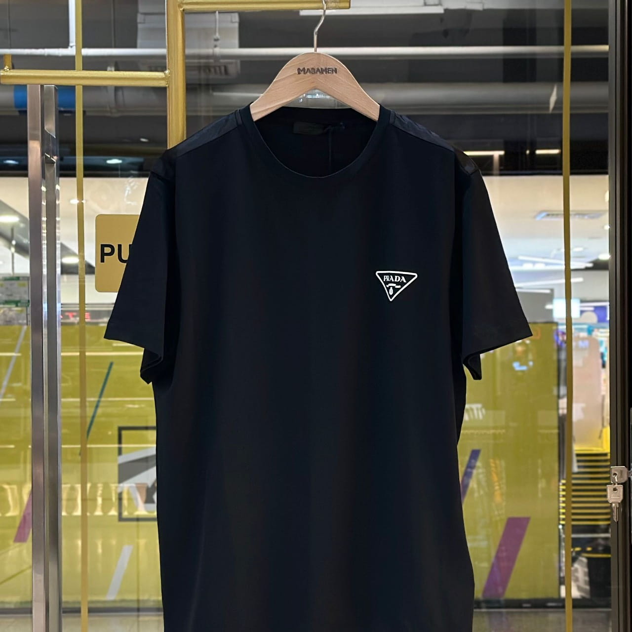 เสื้อยืดคอกลมแขนสั้น สำหรับผู้ชาย จากแบรนด์ Prada พิมพ์ลายโลโก้รูปทรงสามเหลี่ยมของแบรนด์ที่อกเสื้อ ตามแนวไหล่ตกแต่งด้วยผ้ายืด