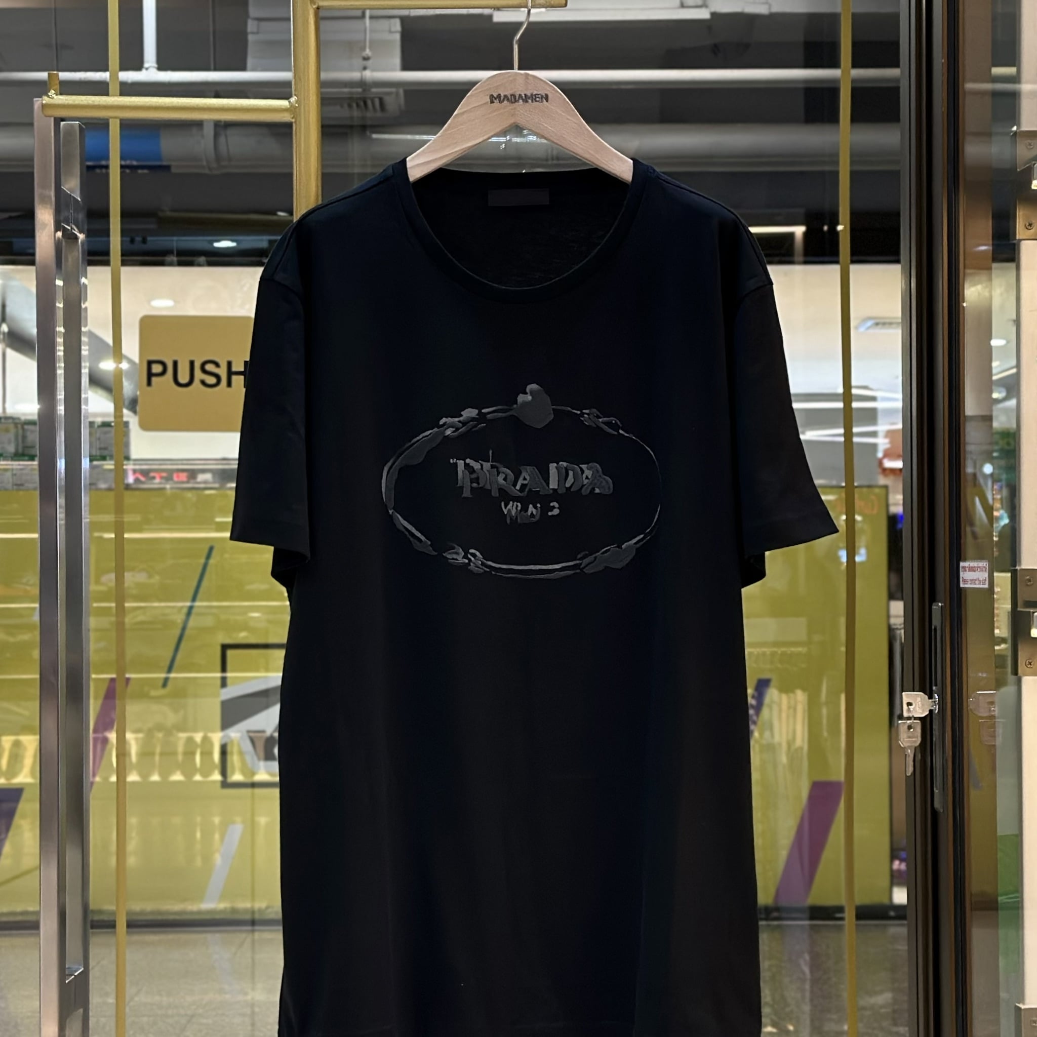 เสื้อยืดคอกลมแขนสั้น จากแบรนด์ Prada ปักลายโลโก้แบรนด์แบบเลือน ๆ