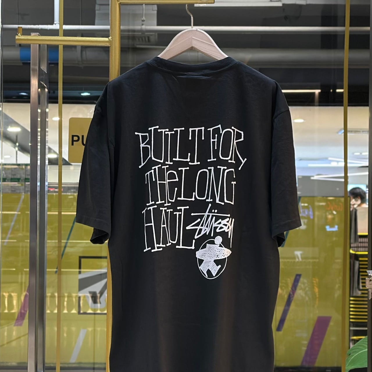 เสื้อยืดคอกลมแขนสั้น ดีไซน์ Unisex จากแบรนด์ Stussy พิมพ์ลายโลโก้และไอคอนที่สื่อถึงการขนส่ง ด้านหลังพิมพ์คำว่า Built for the long haul