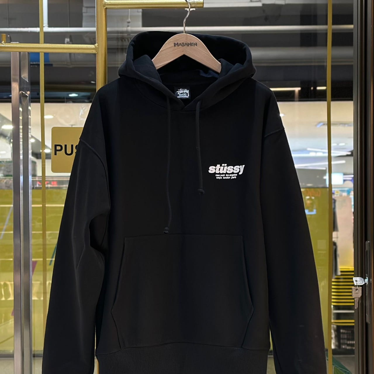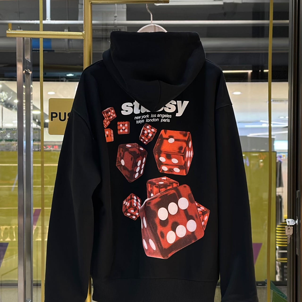 เสื้อฮู้ด จากแบรนด์ Stussy พิมพ์โลโก้แบรนด์ที่อกเสื้อ ด้านหลังพิมพ์ลายลูกเต๋าสีแดงจำนวนหลายลูกที่ถูกทอยลงมา
