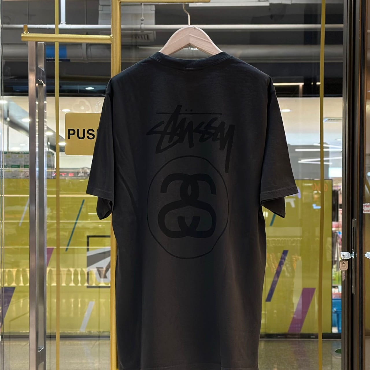 เสื้อยืดคอกลมแขนสั้น จากแบรนด์ Stussy พิมพ์ลายโลโก้แบรนด์ คู่กับโลโก้อักษรย่อ SS ในวงกลม