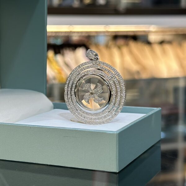 จี้ชาร์มสำหรับทำสร้อยห้อยคอ จากแบรนด์ TSL ตกแต่งด้วยการประดับเพชรแท้และทองคำขาว รูปทรงกังหัน 4 ทิศดีไซน์หรูหรา สื่อถึงการปัดเป่าสิ่งไม่ดี ดึงดูดสิ่งมงคล เสริมโชคลาภ และความก้าวหน้าในหน้าที่การงาน