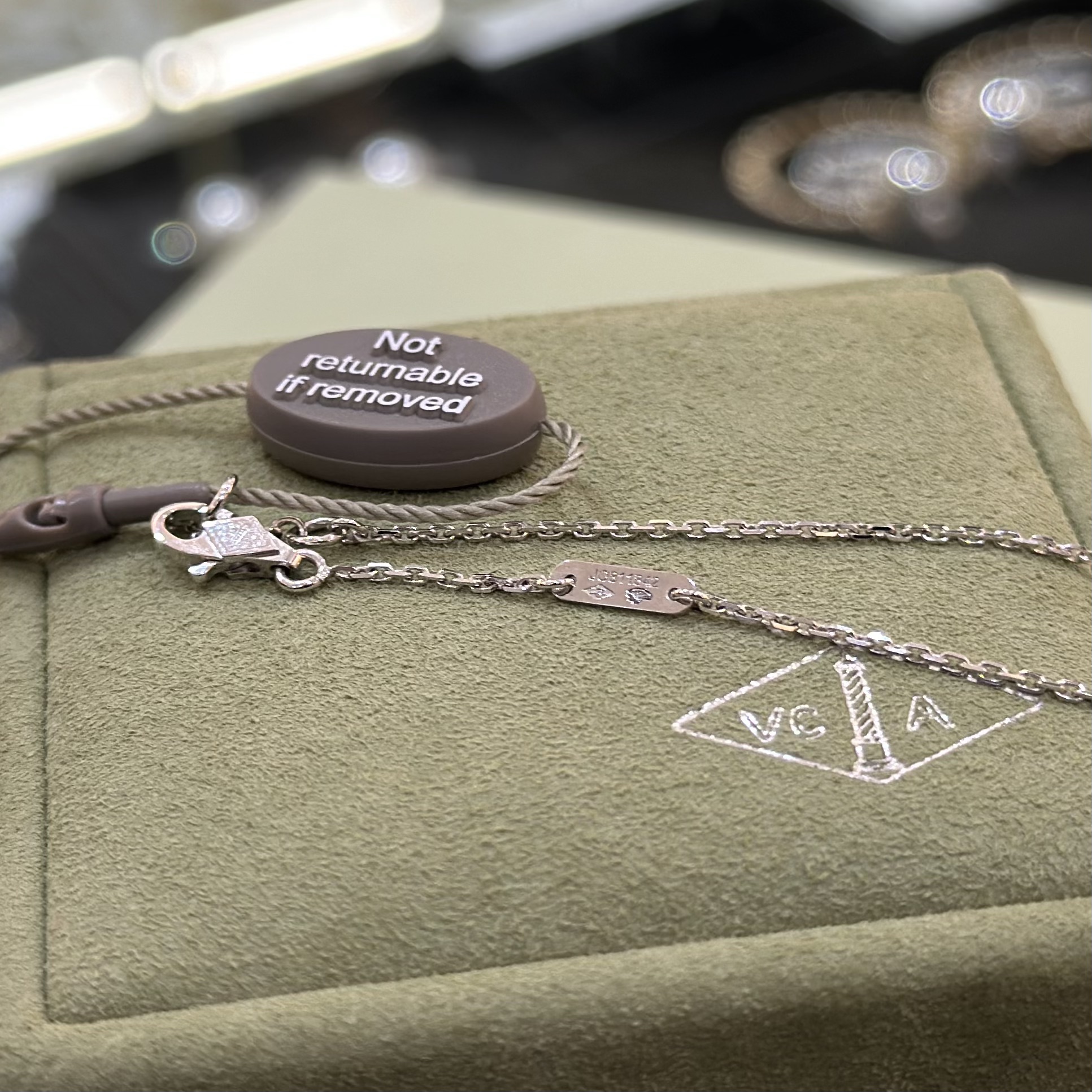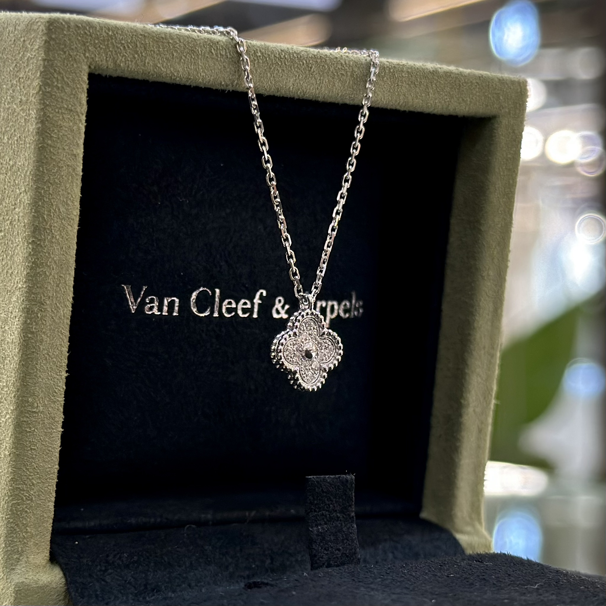 สร้อยคอ จากแบรนด์ Van Cleef & Arpels สายสร้อยสีเงิน Rhodium Plated จี้รูปทรงใบโคลเวอร์ 4 แฉก ประดับเพชรทรงกลมคุณภาพระดับ DEF, IF ที่สื่อถึงเพชรไร้สีที่ไม่มีร่องรอยที่บ่งชี้ถึงการมีตำหนิหรือสิ่งเจือปนแม้ตรวจด้วยกำลังการขยาย 10 เท่า