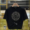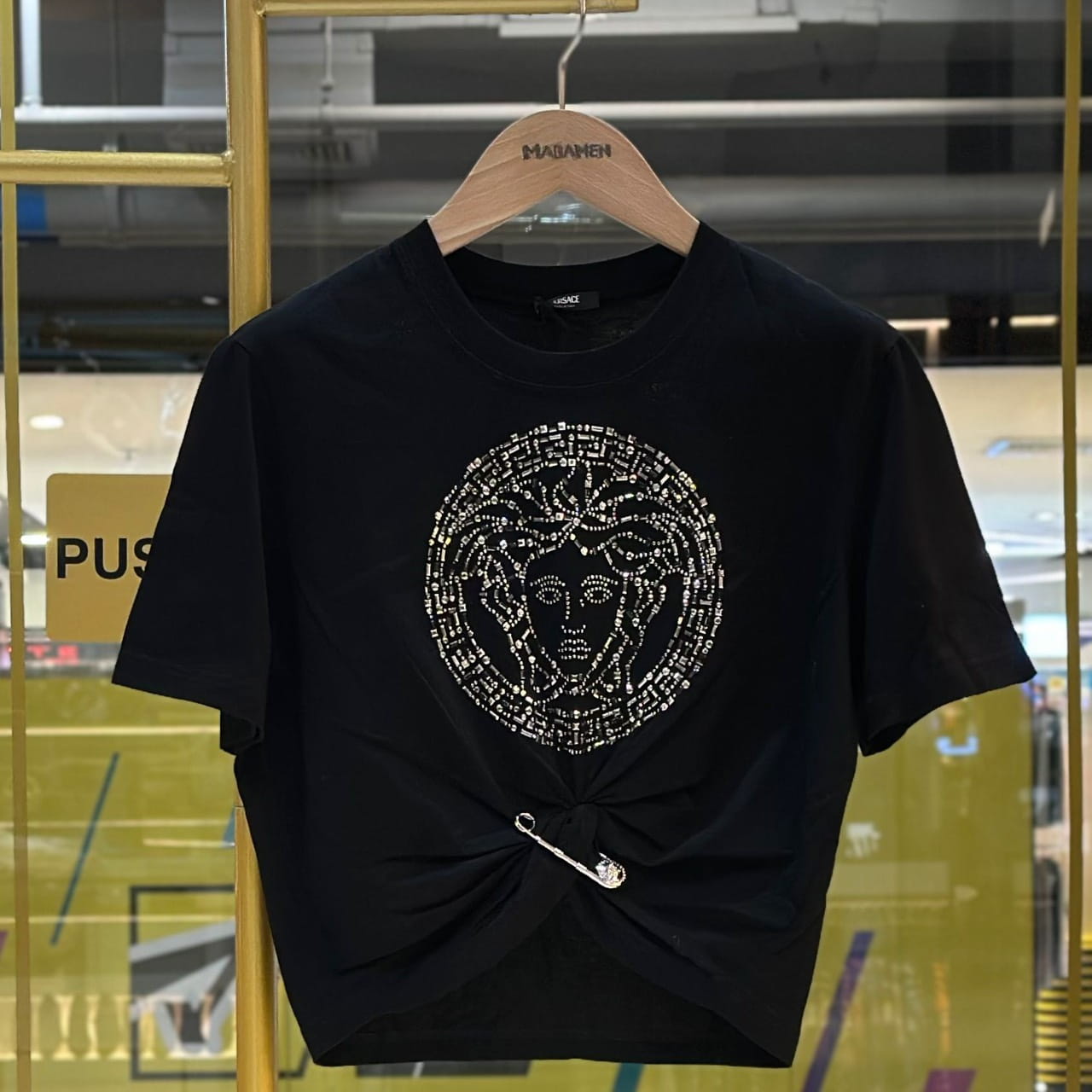 เสื้อยืดลำตัวลอย จากแบรนด์ Versace ปักลายเมดูซ่าที่กลางตัวเสื้อ โดดเด่นด้วยดีไซน์การม้วนพับของตัวเสื้อบริเวณจุดที่มีคลิปหนีบ